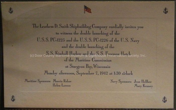 White paper; black print; "The Leathem D. Smith Shipbuilding Co. cordially invites you to witness the double launching of the U.S.S. PC-1225 and the U.S.S. PC-1226 of the U.S. Navy and the double launching of the S.S. Kimball Harlow and the S.S. Freeman Hatch of the Maritime Commission at Sturgeon Bay, Wisconsin, Monday afternoon, Sept. 7, 1942 at 1:30. Maritime Sponsors: Marcia Rabas, Helen Larson; Navy Sponsors: Jean Hellber, Marge Kenney."Location
