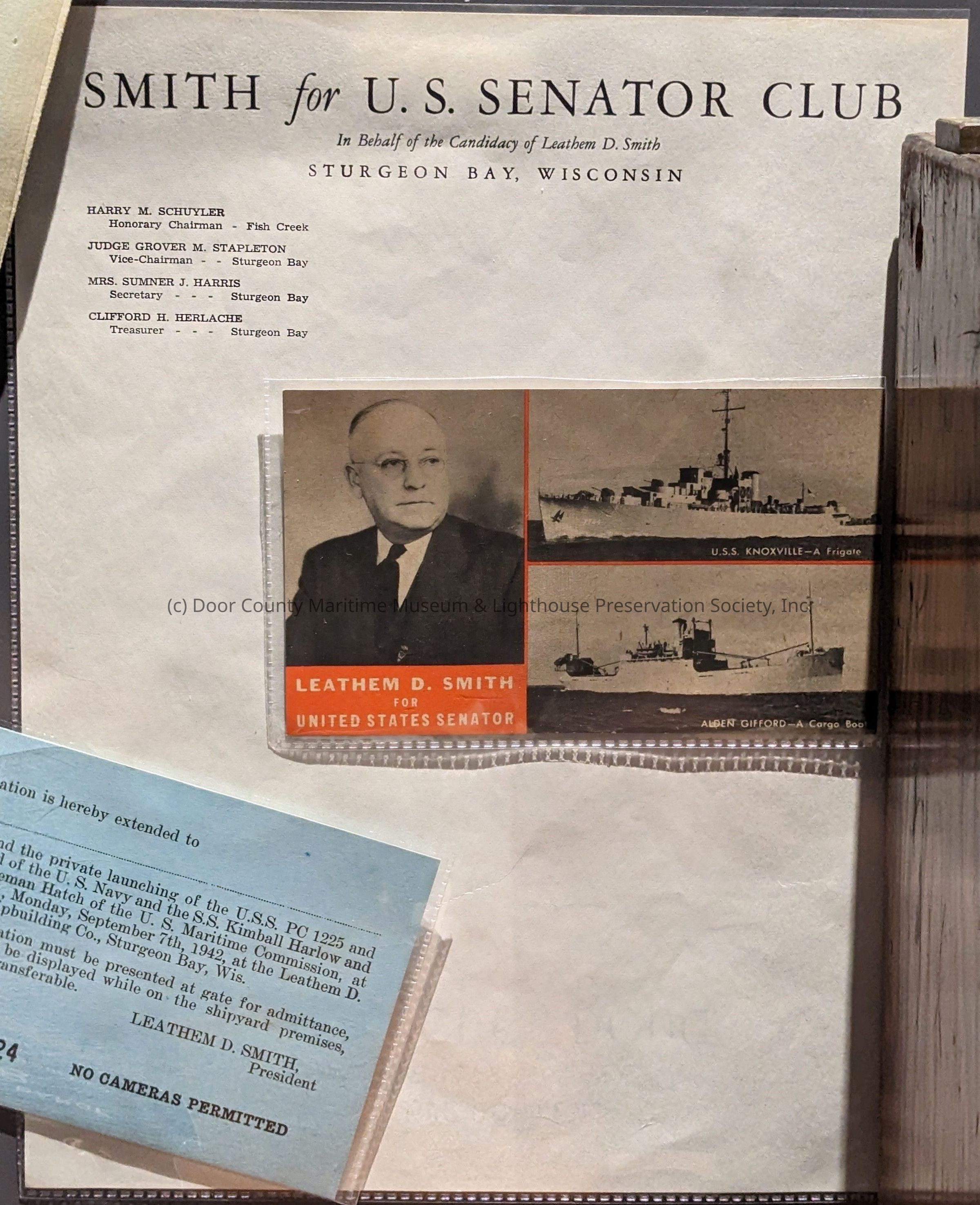 Letterhead; white paper; black print; "Smith for U.S. Senator Club" in behalf of the candidacy of Leathem D. Smith, Sturgeon Bay, Wisconsin; list of officers on left side.Location