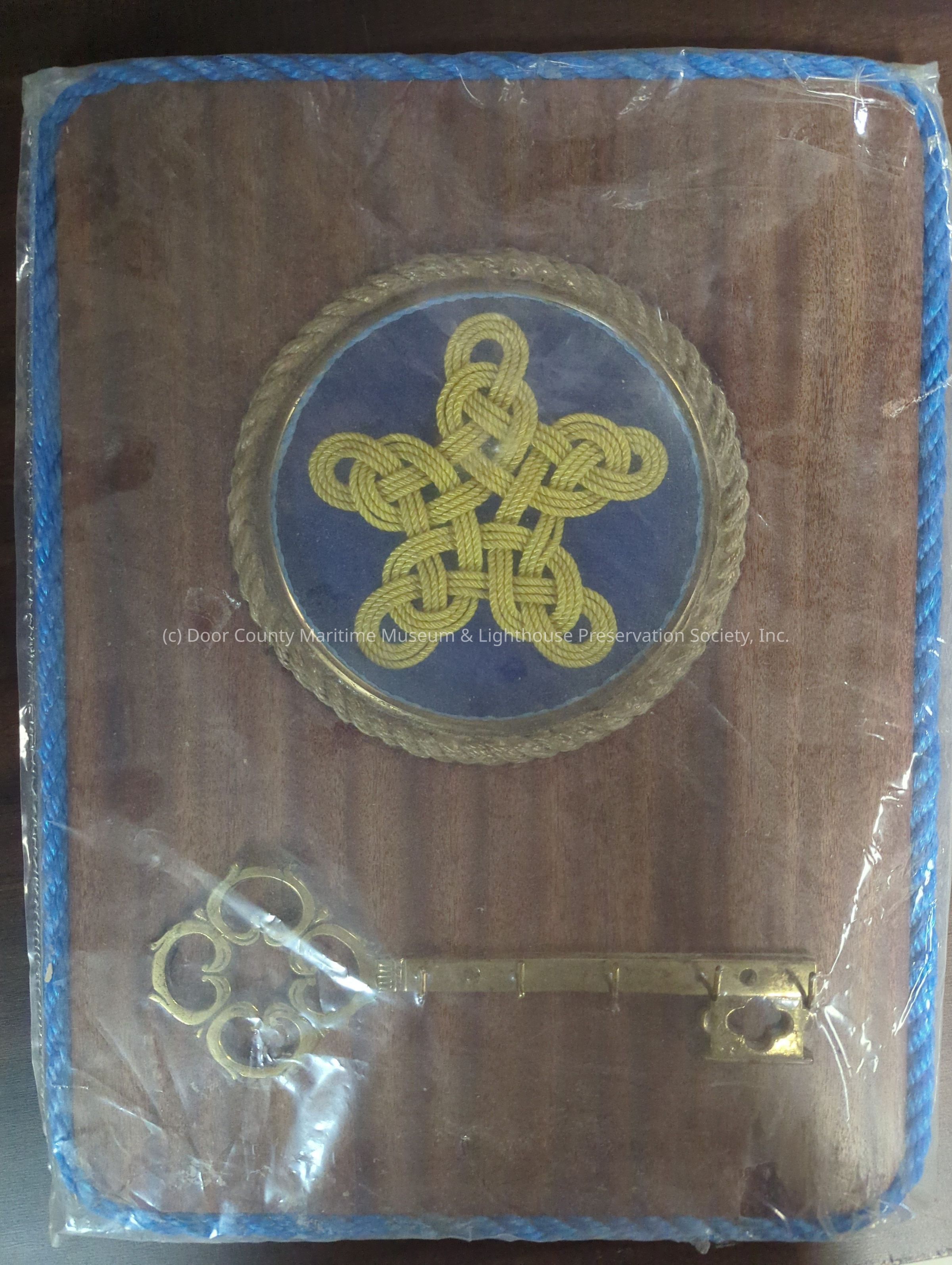 Knot board: display board varnished wood, blue rope trim; 8" dia. circle trimmed with gold metal; inside yellow knot with blue rope trim around circle--covered with glass; gold metal key rack in shape of key with five hooks; back painted tan; metal hanger on back.Location