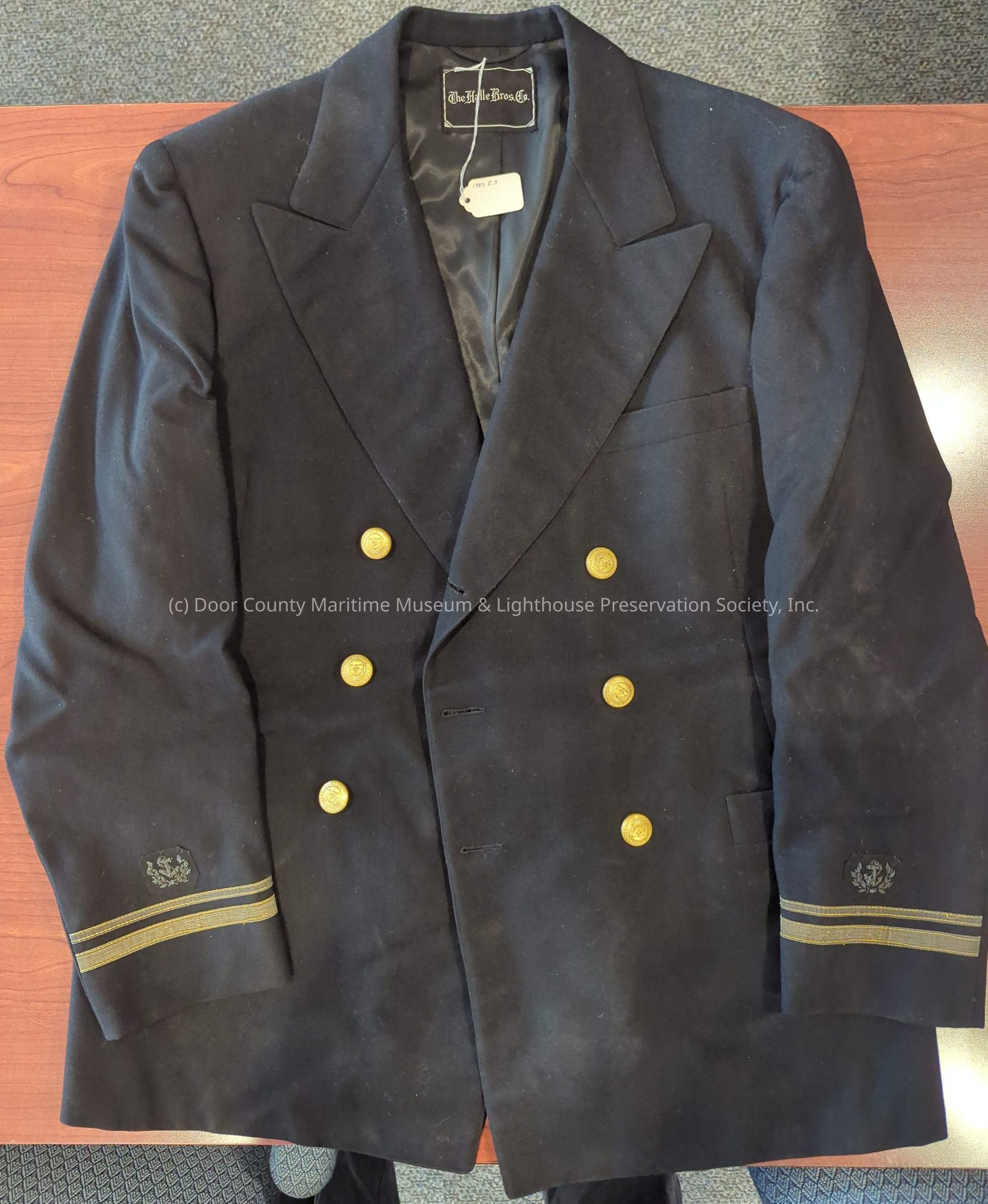 Uniform jacket: black; three gold buttons each side; gold trim on sleeves; Merchant Marine insignia on sleeves; label inside..."Regulation U.S. Navy Uniform." buttons say "United States Maritime Service"; needs cleaning.Location