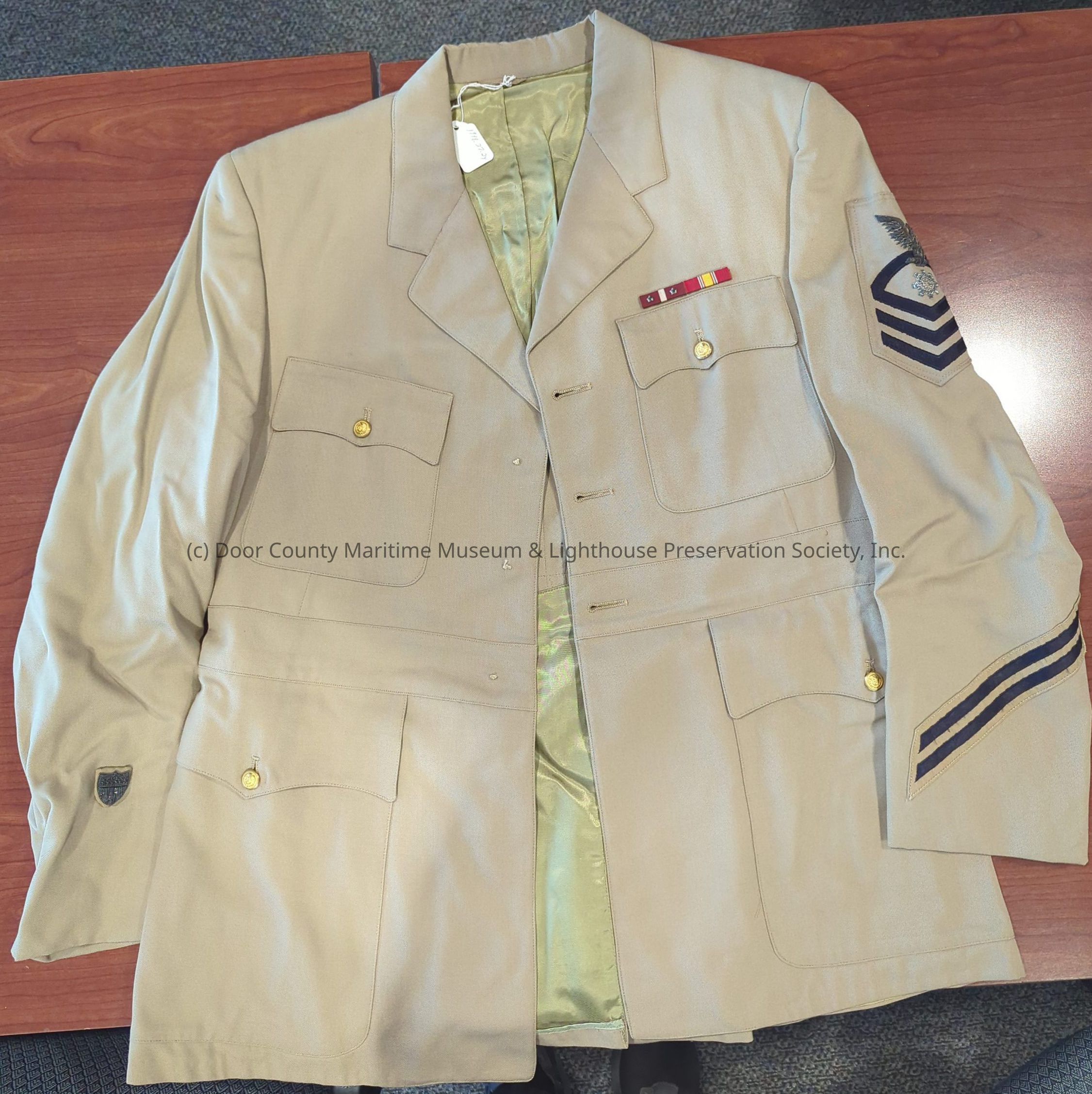 USCG uniform jacket: overall color tan; 2 ribbons over left top pocket (dark red); chief's patch and 2 angular length of service stripes on left sleeve (dark blue); brass buttons on pockets; some buttons missing; Coast Guard shield emblem on right lower sleeveLocation