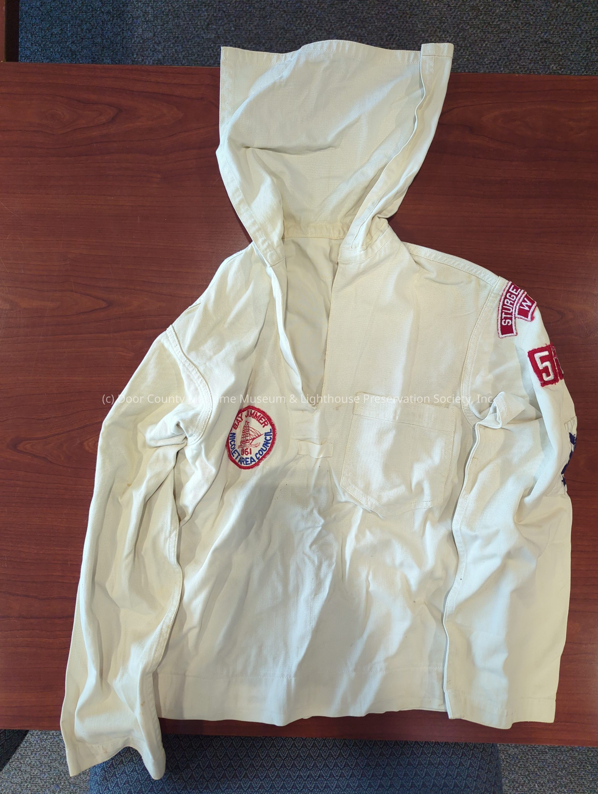 Sea Scout uniform shirt: white; pocket; long sleeves; 3 sewn-on badges on left sleeve: (Sturgeon Bay, Wis (red and white); 500 (red and white); Sea Scout insignia (blue, white, red); circular badge on right chest: Bay Jammer Nicolet Area Council 1961 (red, white, and blue).Location