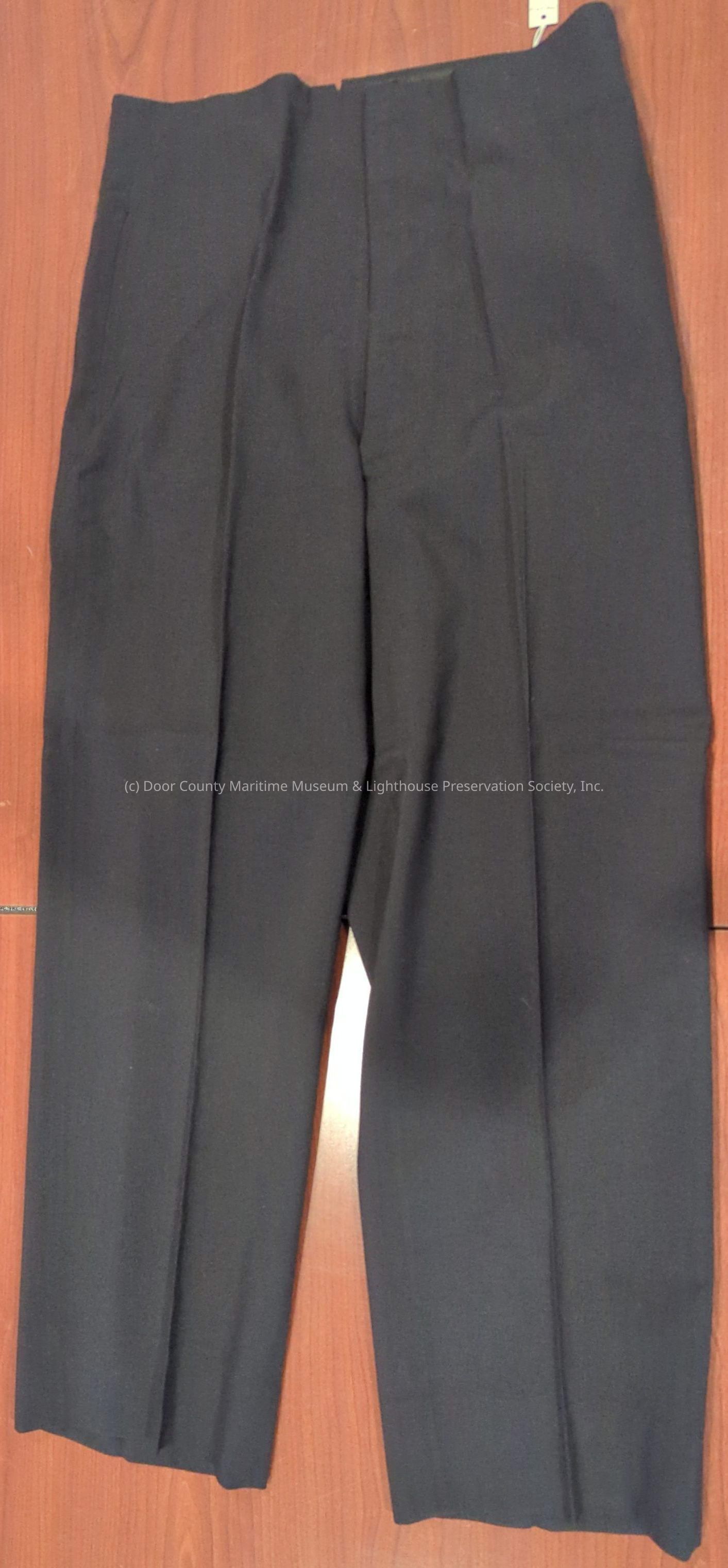 Merchant Marine uniform pants: overall color dark blue; 1" velvet stripe running vertically outside center of leg (waist to floor); zipper fly; sash pockets.Location