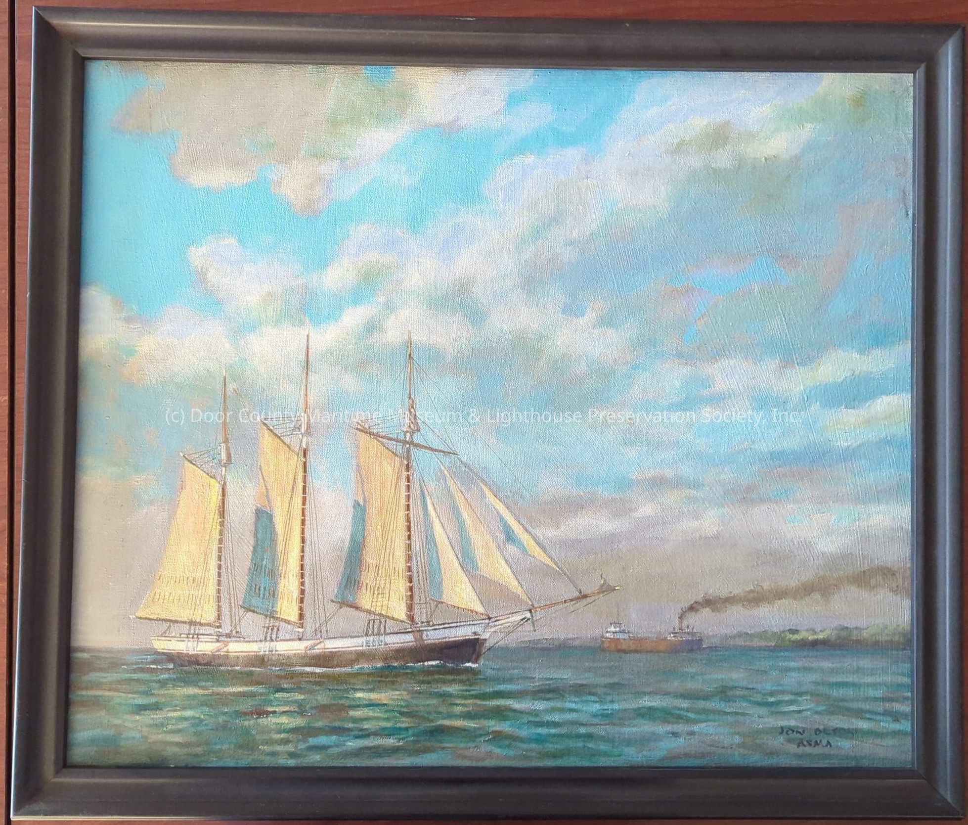 Oil painting on canvas with wooden frame. Depicts the Skeele enters the Sturgeon Bay canal from Green Bay circa 1910