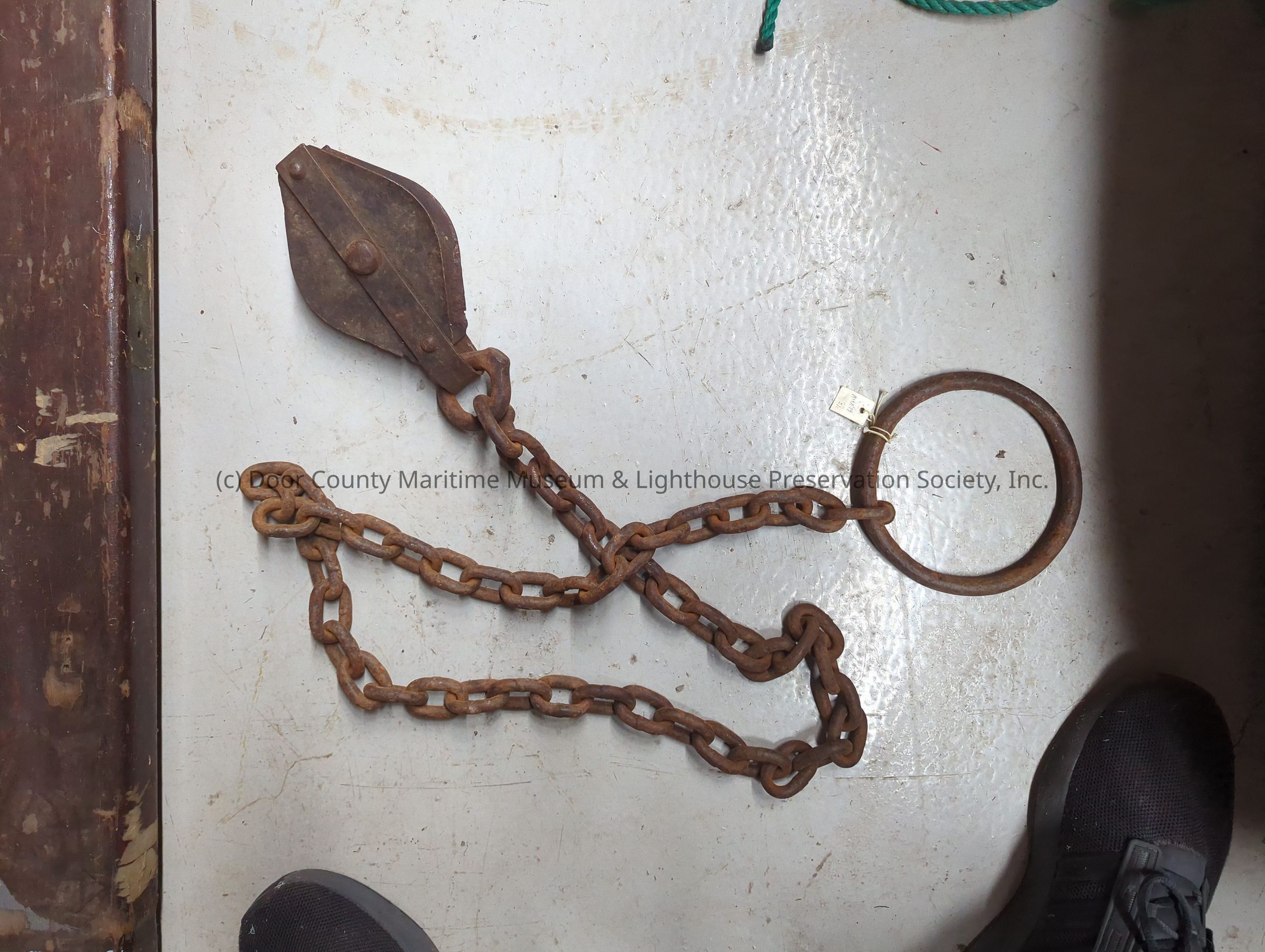 Brown metal with corroded surface. Pulley on one end and large hoop on the other with a chain connecting the two