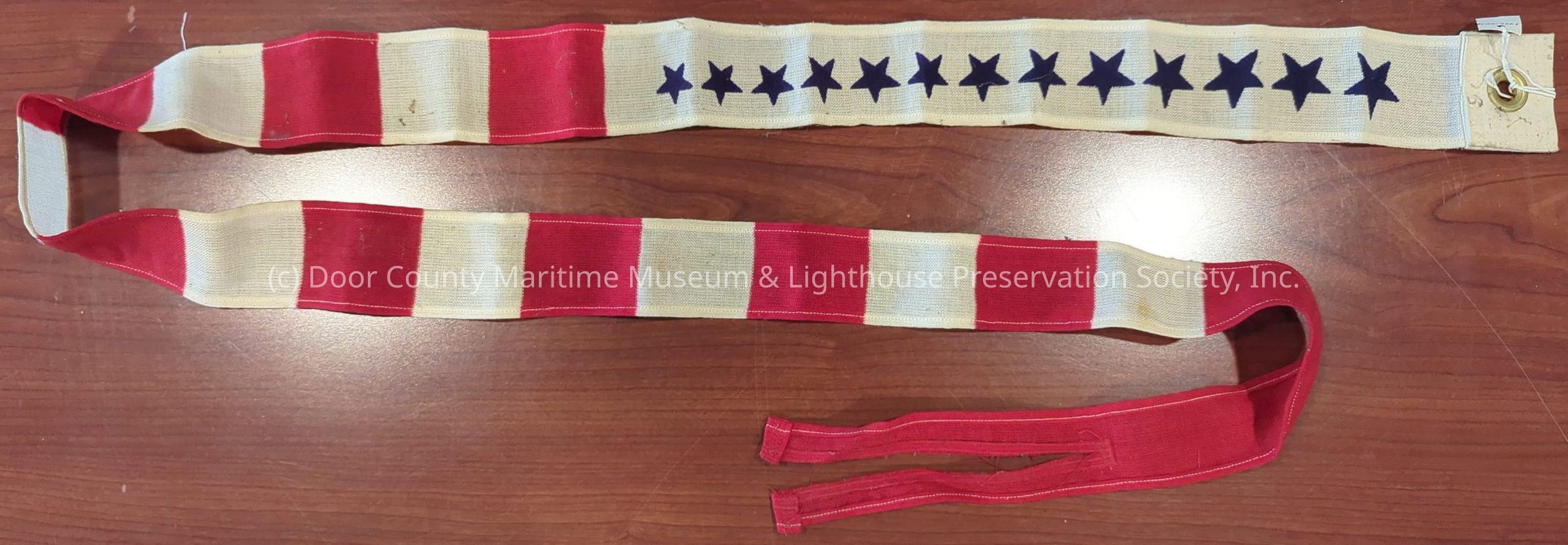 Banner: red,white with blue stars; long, thin banner (2-sided); brass grommet at one end for attachment.Location