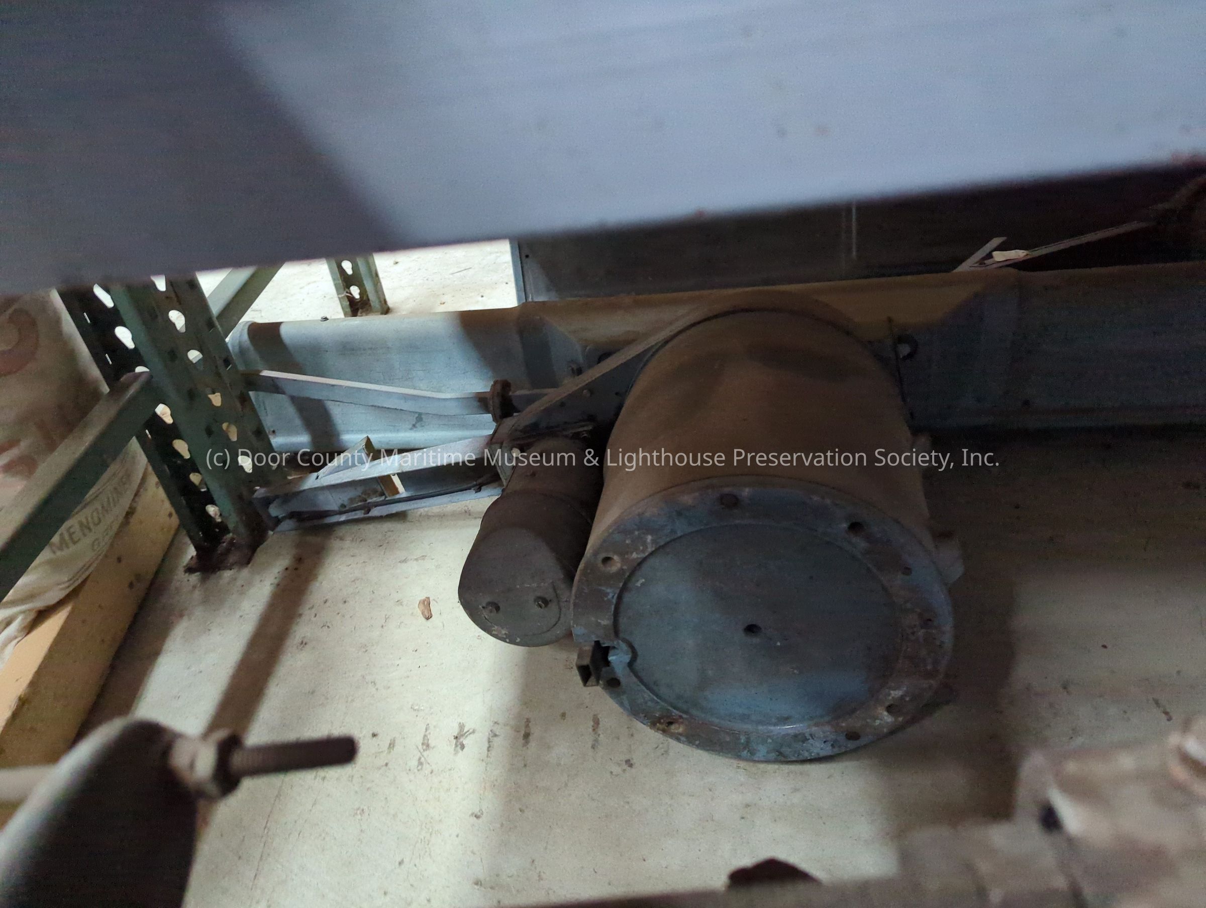 Metal, bluish grey radar unit. Raymore Class X. Motor Alternation Type TEWT. Metal plate shows input, output, etc. The long section rotates and is on cylinder shaped base