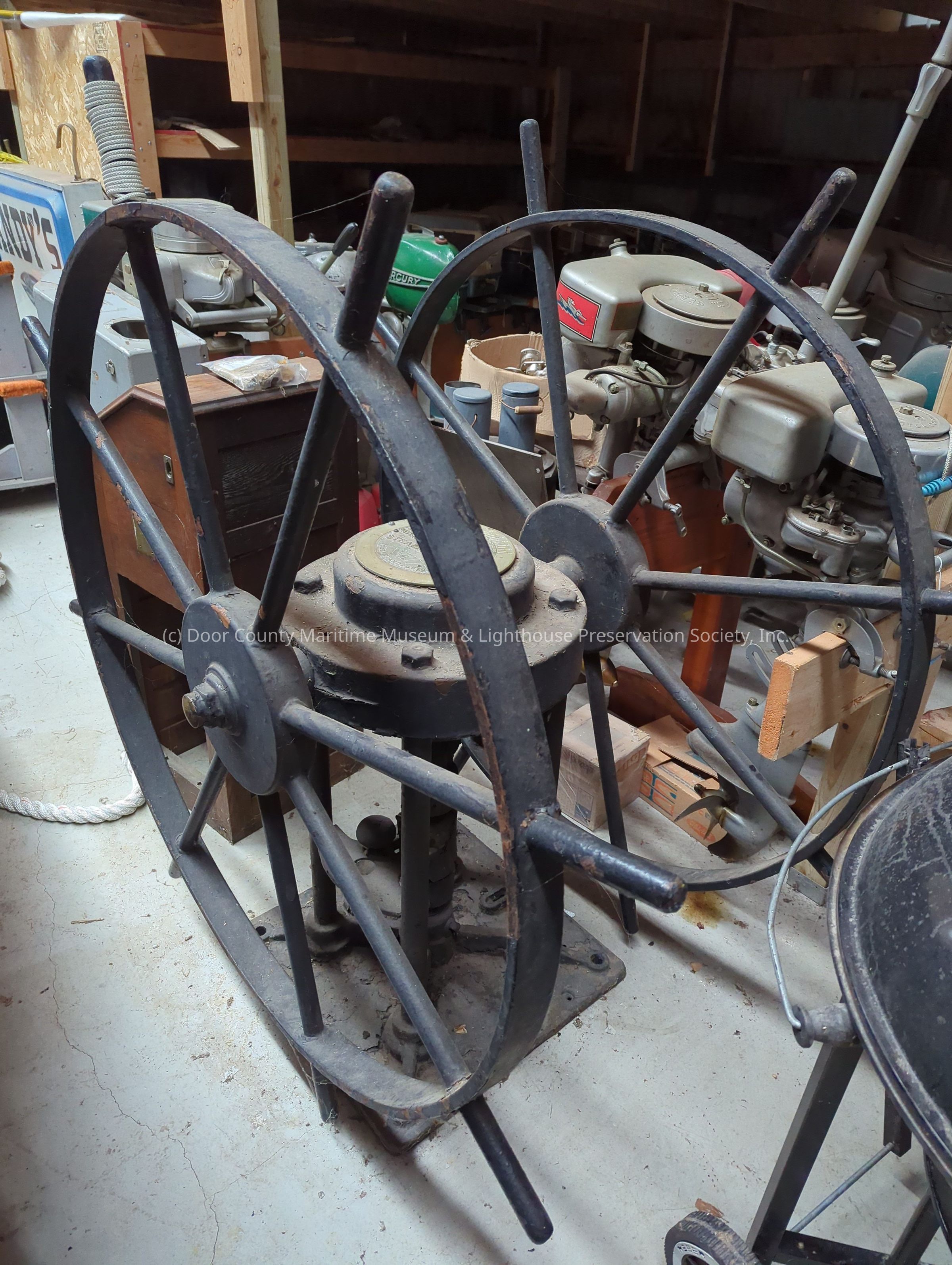 Painted black double steering wheel. Circular plate in center. "The American Shipbuilding Company. The globe- patented Jan. 7, 1890: Cleveland, Ohio" White rope around outer edge of one spoke.