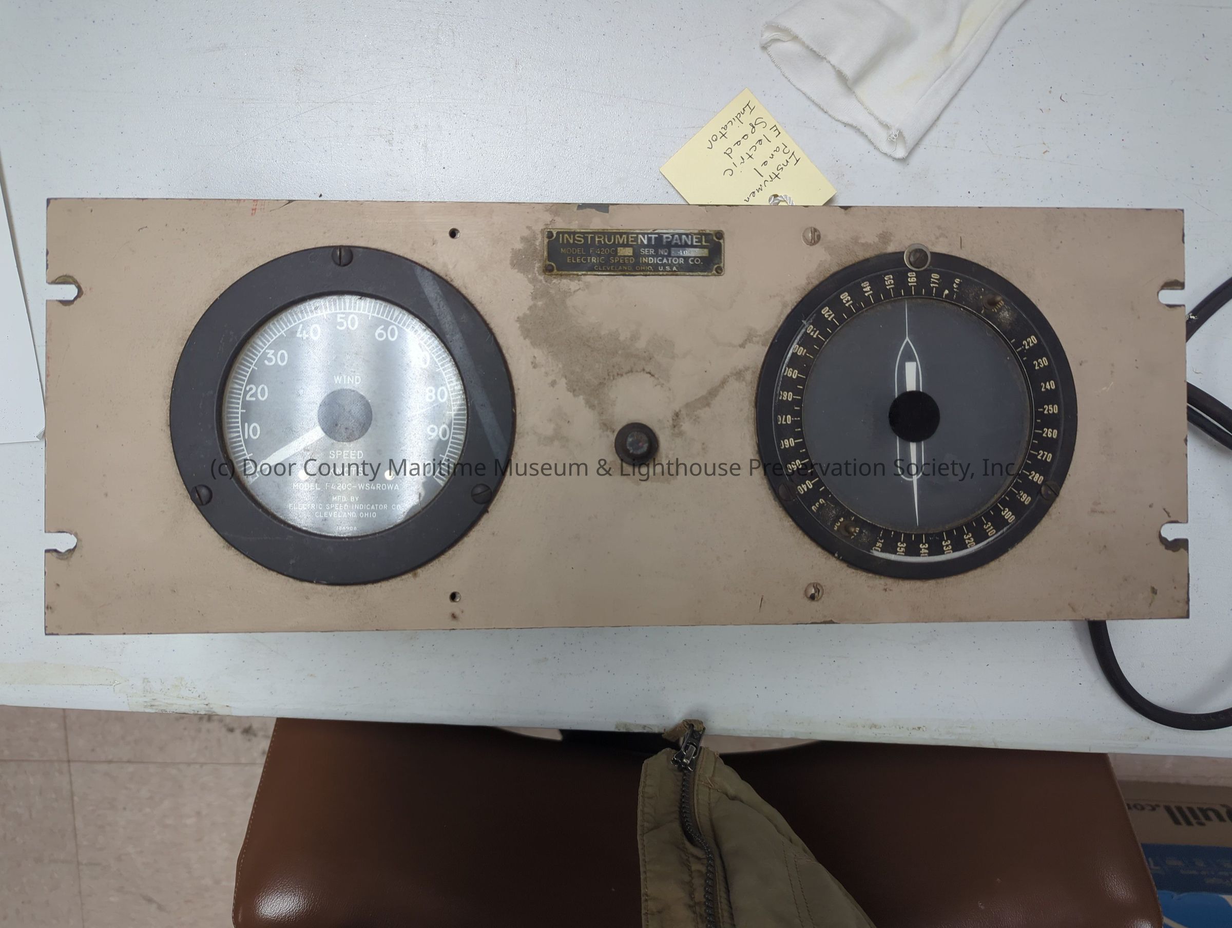 Two round gauges on metal tan plate. Electronics on back with cables. Wind speed indicatorLocation