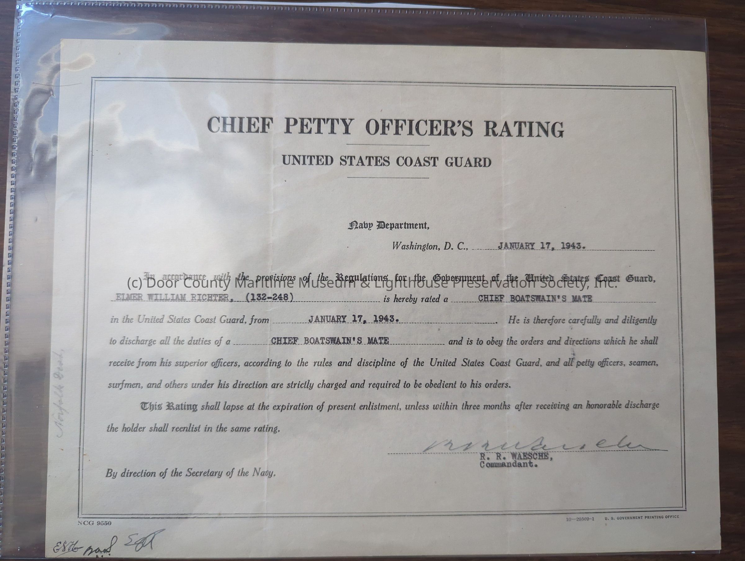 Elmer Richter Chief Boatswain's Mate Certificate