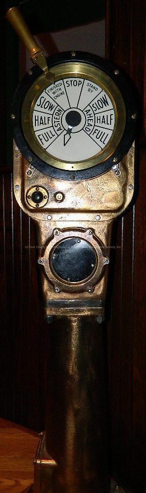 A plate below the face has "Bell Signal" engraved on it; it is a small circular plate around a centered knob; a khaki or beige color - the rectangular top portion sets on a cylindrical, tapered stand; the base of this has holes for mounting on a deck; there is a square access plate bolted on near the base; two round recessed plates are bolted on either side below the top area front and back; plates are bolted to upper sides with round face with an arrow and moveable handle attachment on the front side; beneath the glass face are directions: "Full/Half/Slow/Ahead, etc."; and another arrow coming from a center plate; refinished to bronze color.Location
