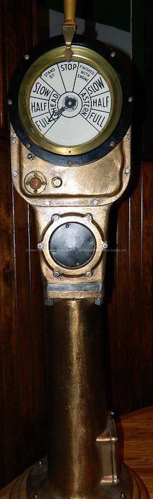 "Bell Signal" is engraved on a small circular plate (located below face); kahki or beige colored; rectangular top portion sets on a cylindrical, tapered stand; the base of this has holes for mounting on a deck; there is a square access plate bolted on near the base; two round recessed plates are bolted on either side below the top area front and back; plates ae bolted to upper sides with a round face with an arrow and moveable handle extension on the front side; beneath the glass face are directions: "Full/Half/Slow/Ahead, etc." and another arrow coming from a center plate; refinished to bronze color.Location