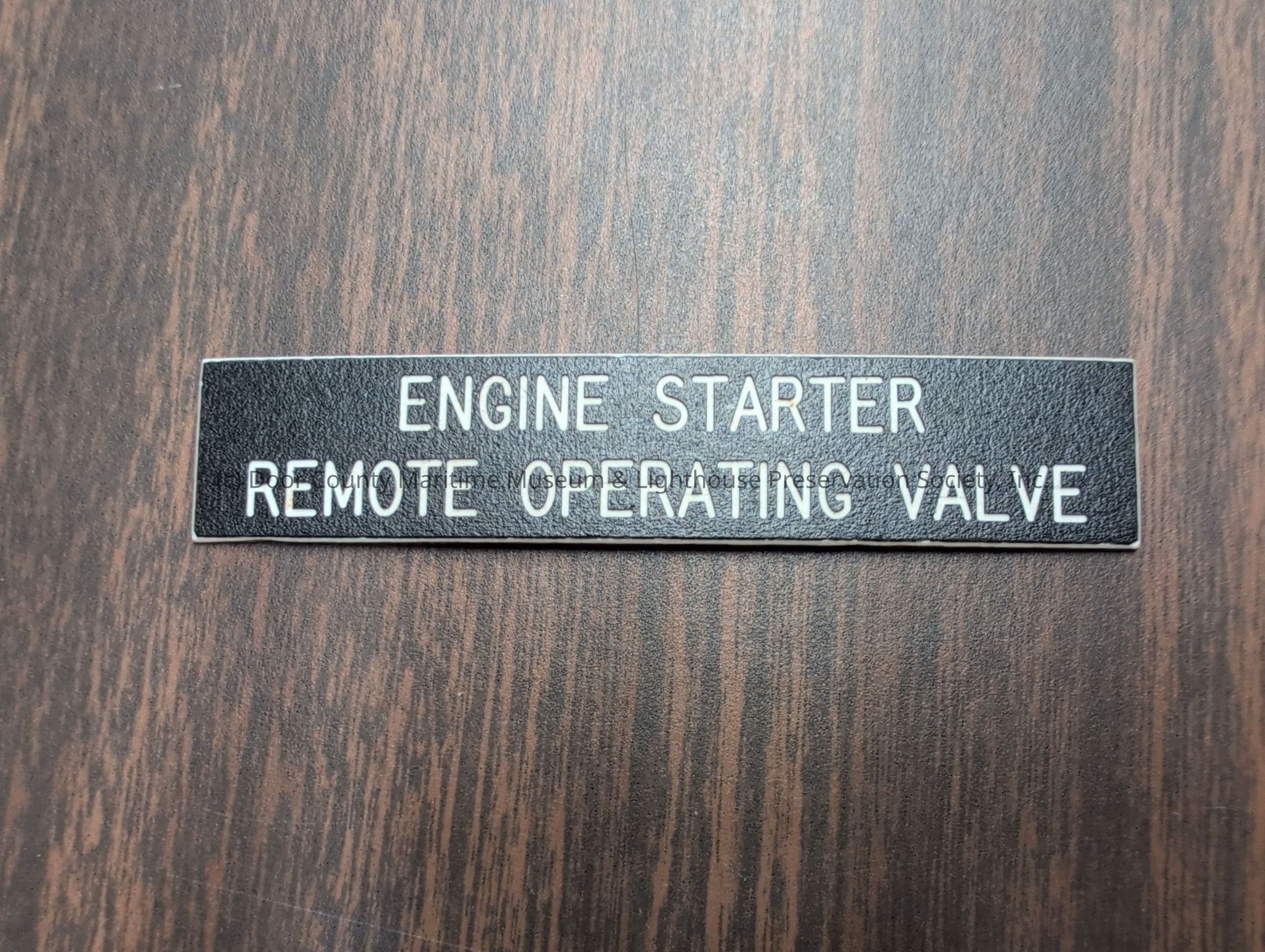 Wooden nameplate stating "Engine Starter Remote Operating Valve
