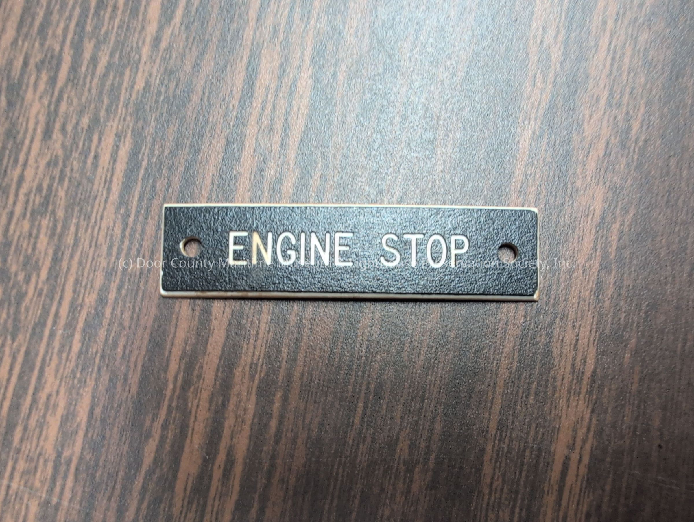 Black wooden nameplate with white text "Engine Stop"