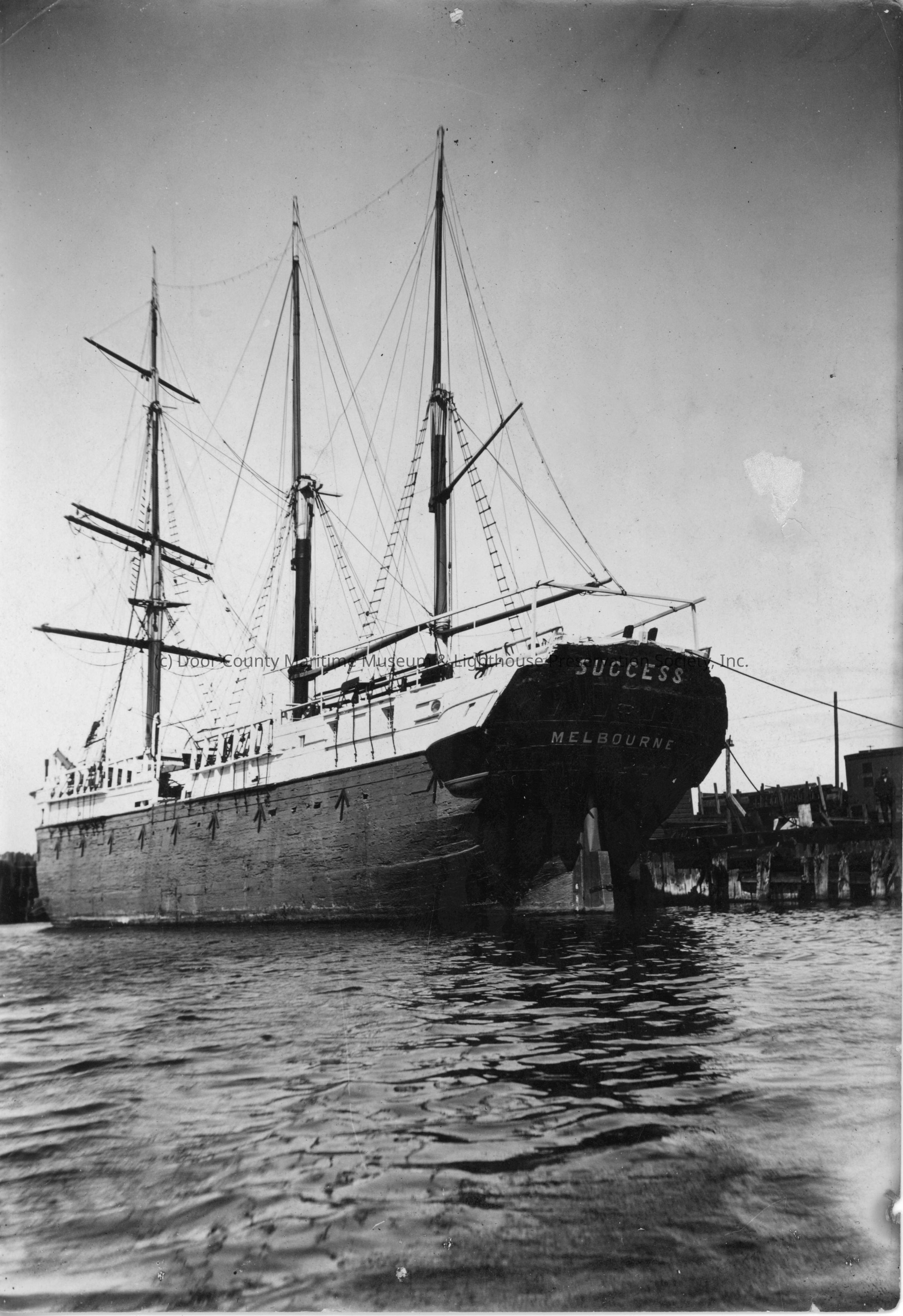 quote on back, "Old English convict ship which has been on exhibit in different lake ports the past two years. Think she is now at Muskegon, MI. This was taken at Ludington Summer of 1924." On vessel, "Success... Melbourne."Location