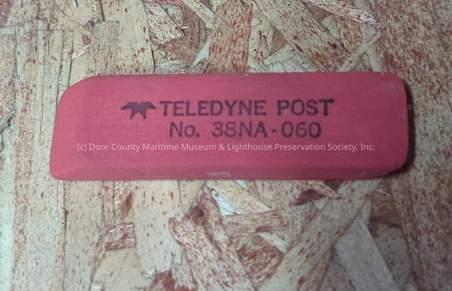 Red eraser with black print "Teledyne Post No.28NA-060"