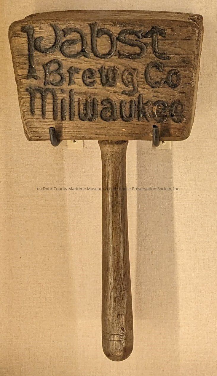 Wooden mallet with black head. "Pabst Brewg co Milwaukee" etched into side of head.