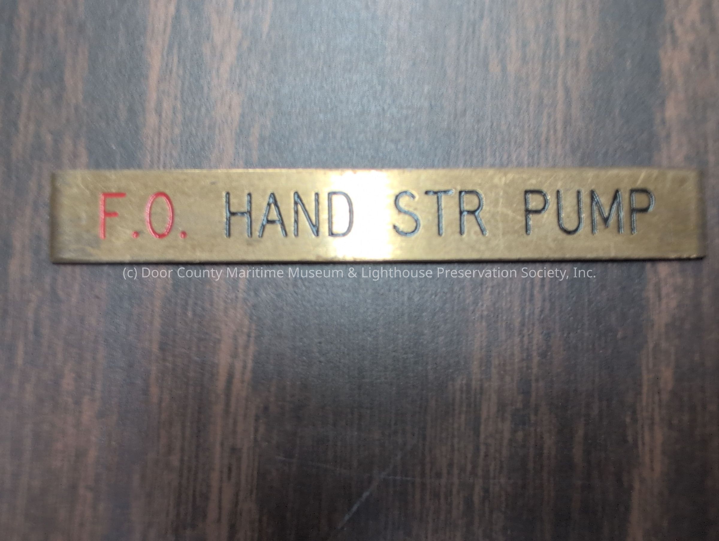 Brass nameplate stating "F.O. Hand STR Pump Nameplate"