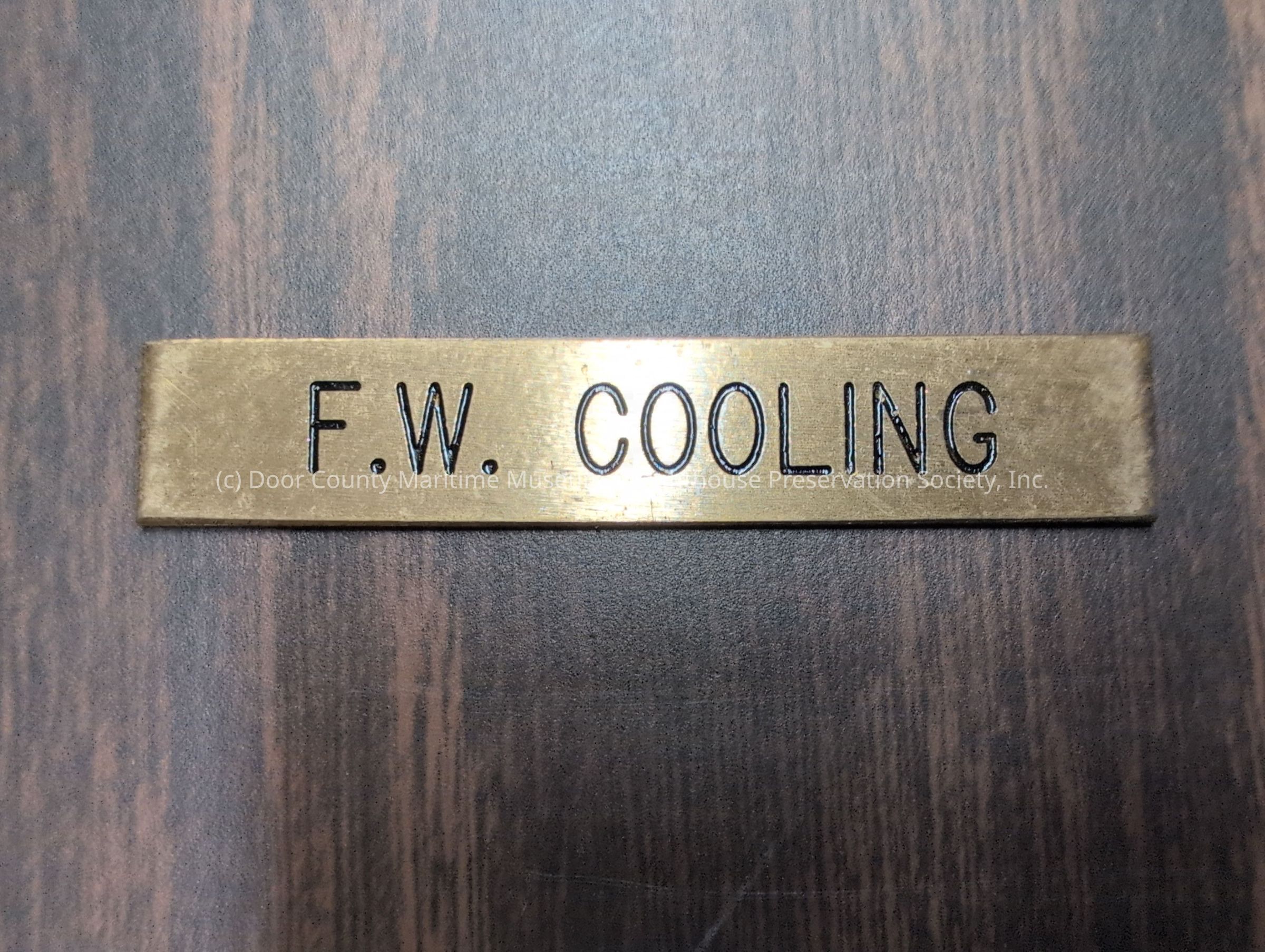 Brass nameplate stating "F.W. Cooling"
