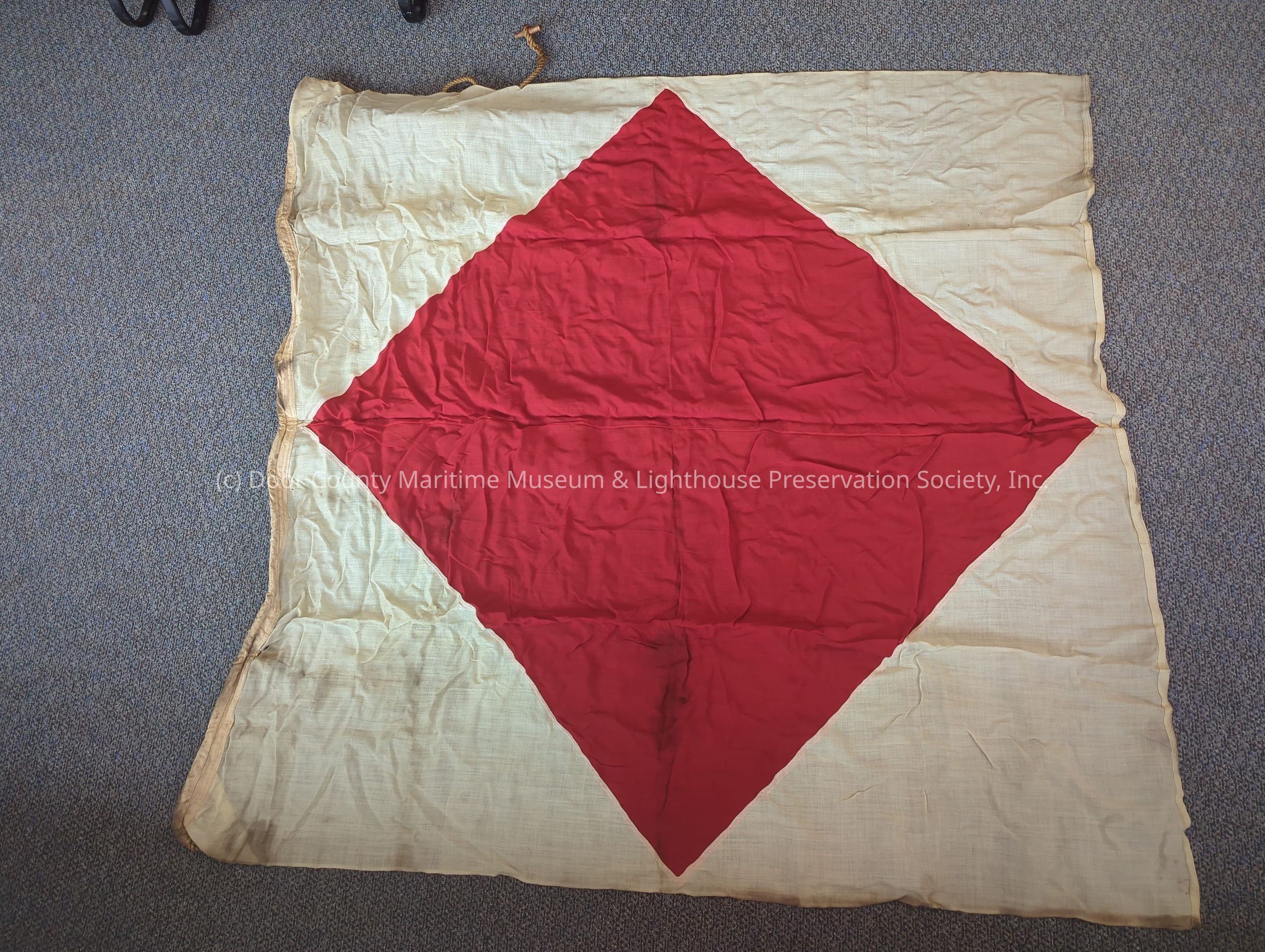 Signal flag: "F"; white square with red diamond in center; dirty.