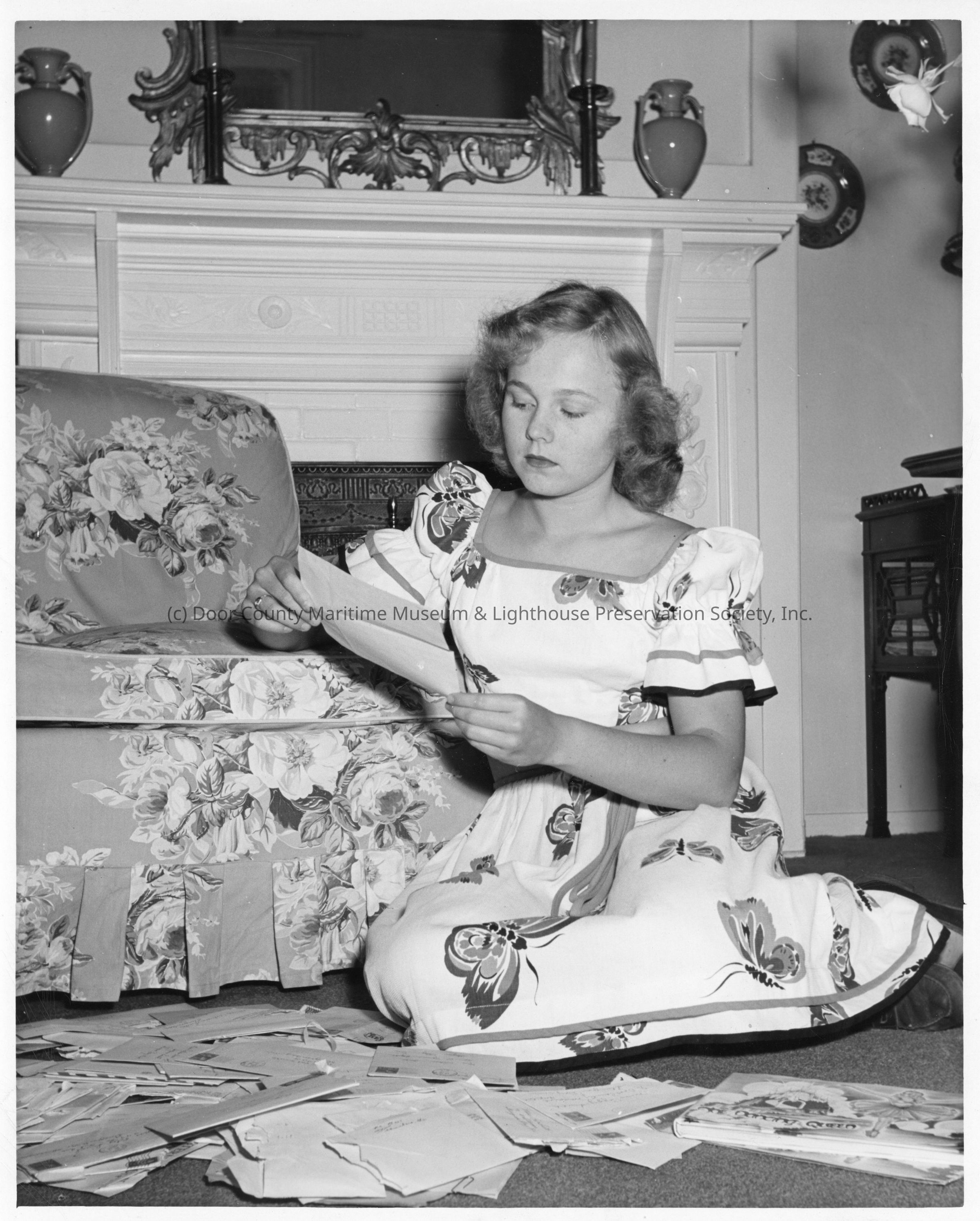 Patsy Smith wearing a dress sitting on floor reading a letterEntry/Object ID