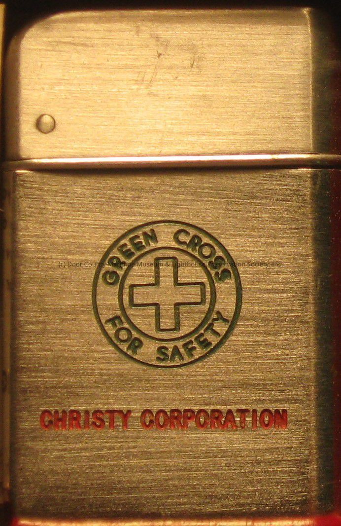 Silver, green cross for safety circle on front Red Christy Corporation.