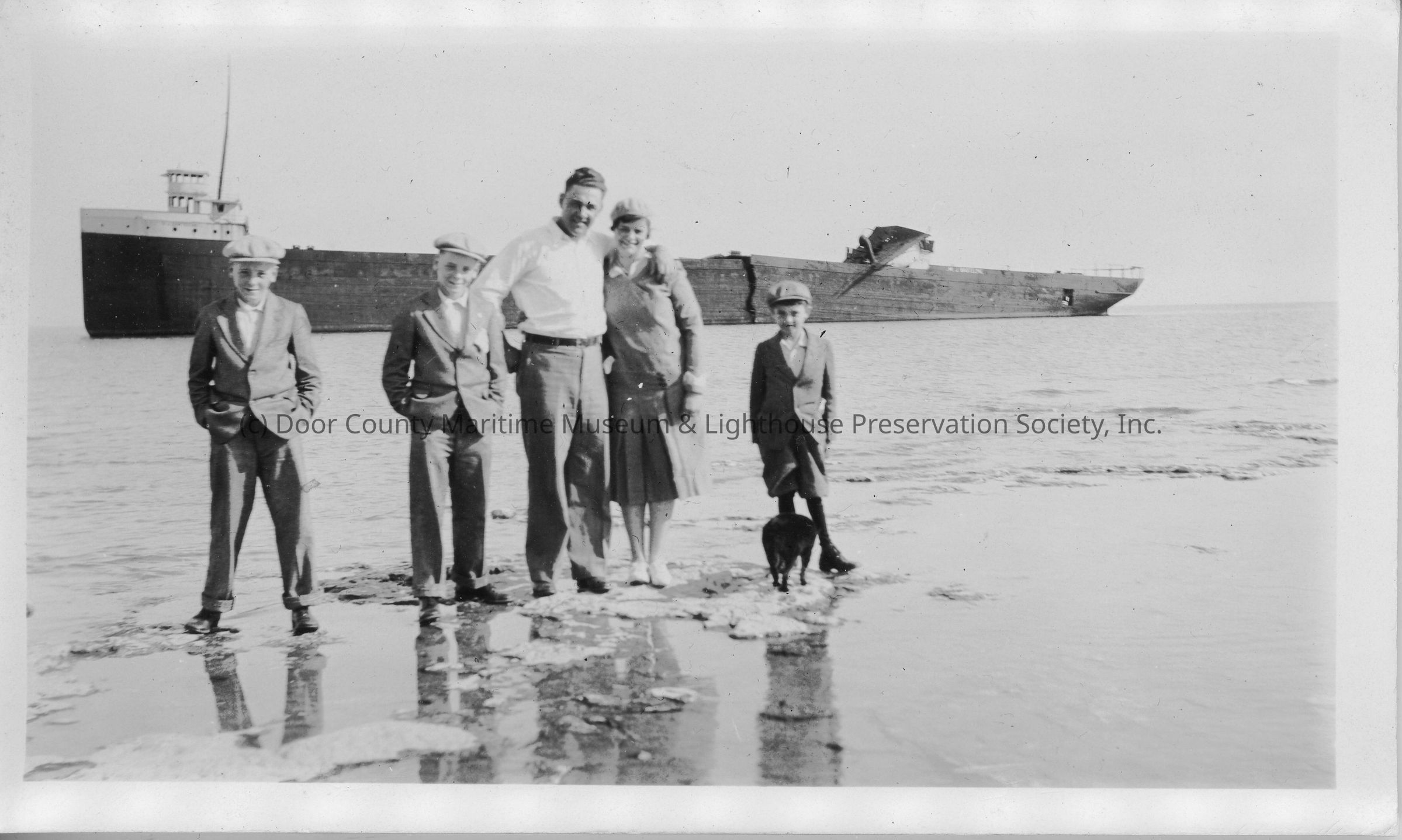 Family with dog posing in front of wreckage of the Bartelme off of Cana Island