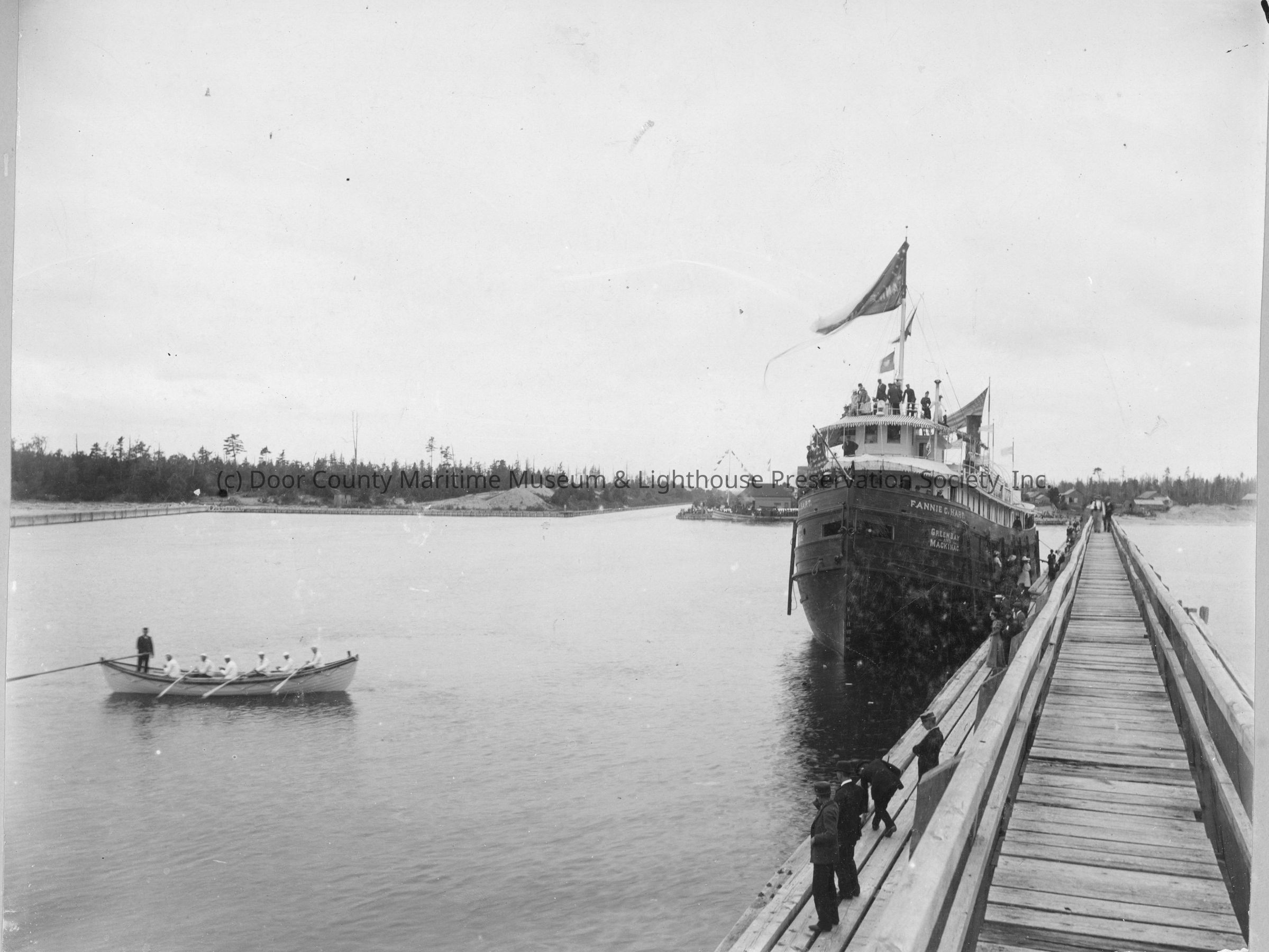 Fannie C. Hart touring boat at a wooden dock on one end of the channel