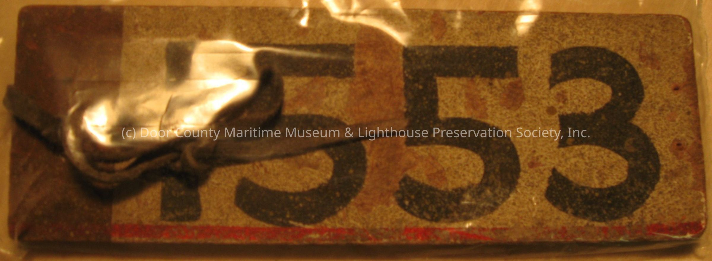 Wood identification tag w/hole on left side that a leather tie goes through. ";1553" printed on front side.