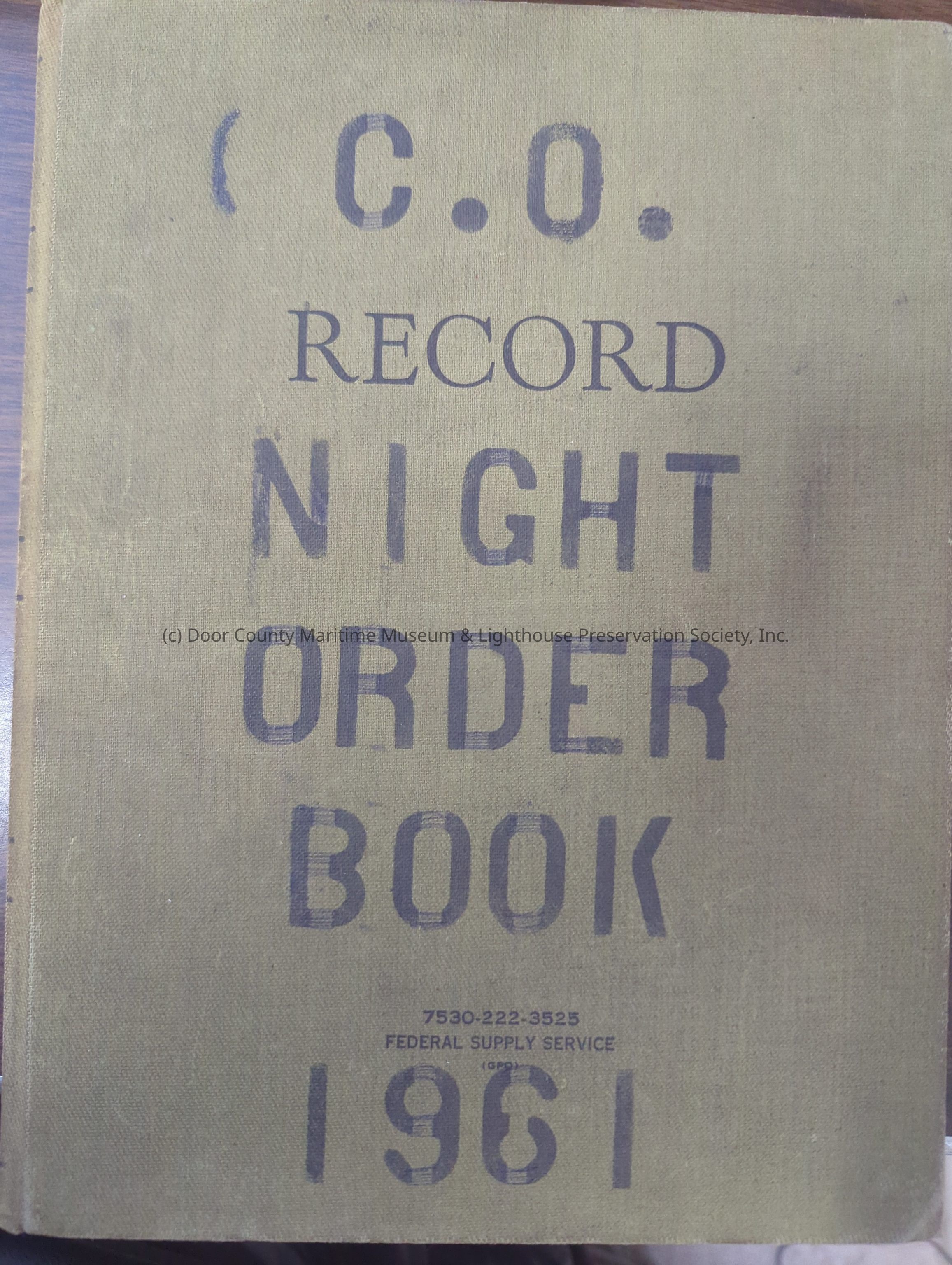 Dark green canvas covered notebook. Black text "c.o. night order book 1961" stamped on cover