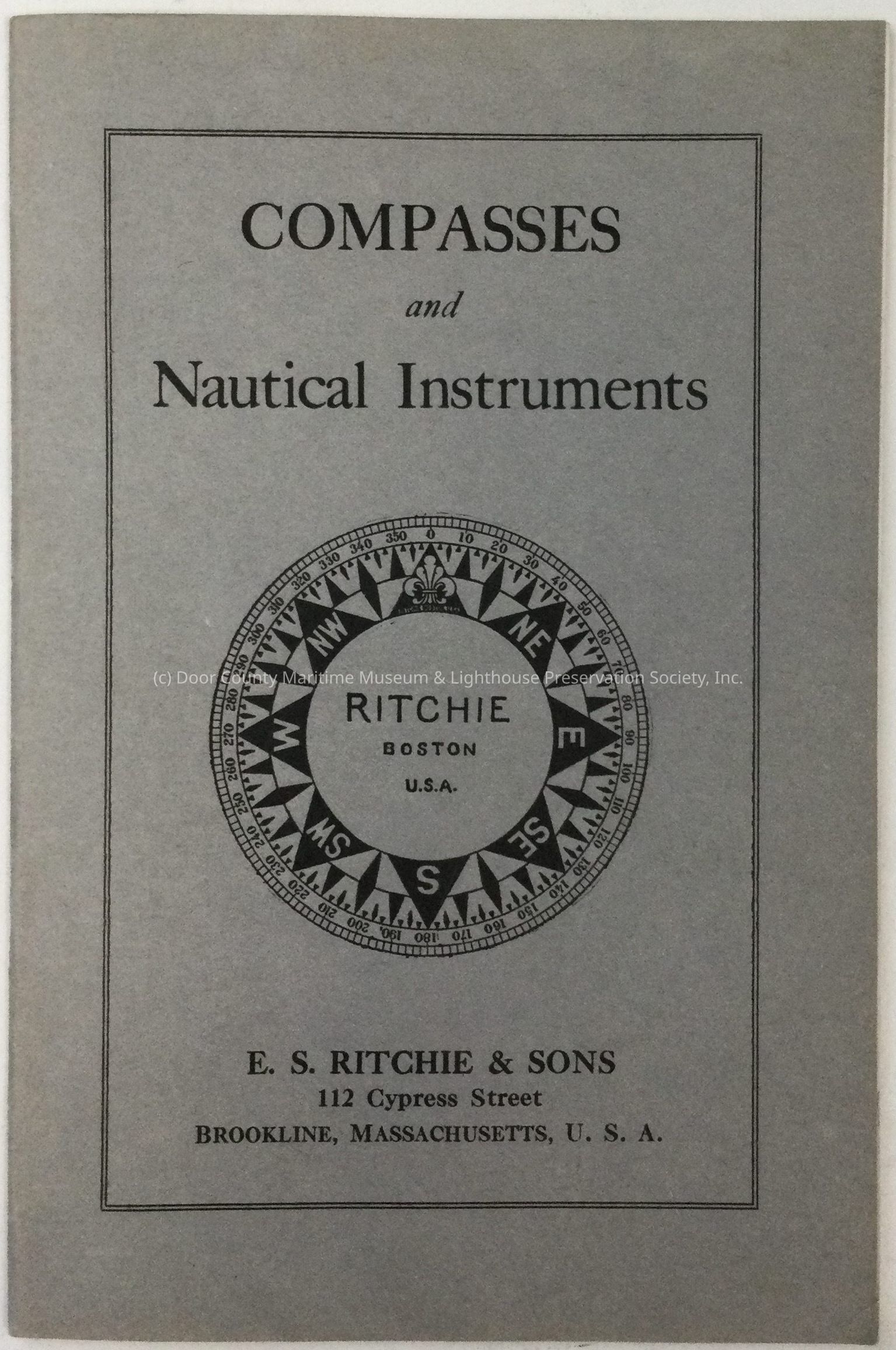 E.S. Ritchie and Sons Compasses and Nautical Instruments Catalog. Grey booklet with black text. Picture of compass in center of bookletLocation