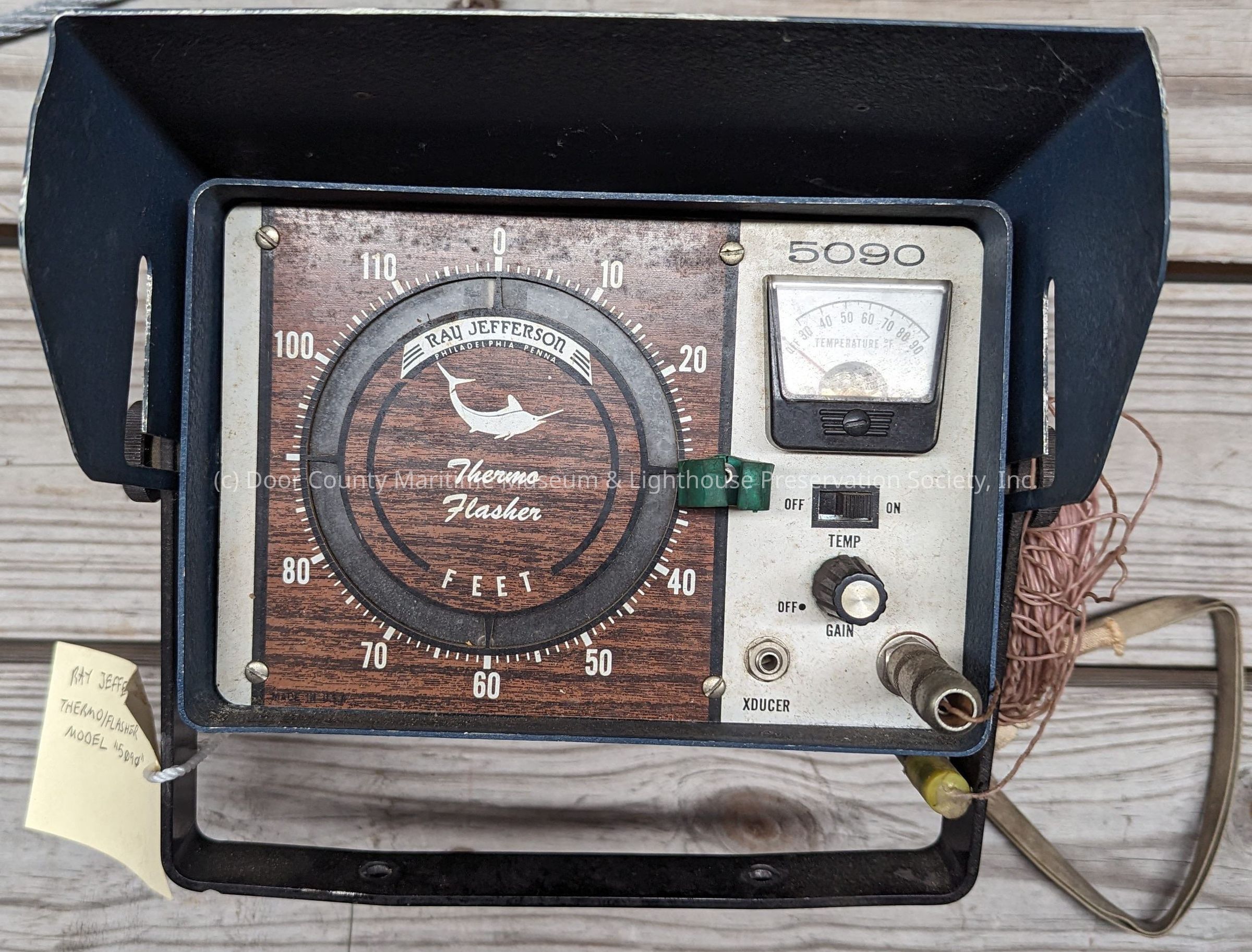 Dark green metal. Transductor and temperature probe and instruction manual with unit. Attached metal plate to hood has depth probe and temperature slates