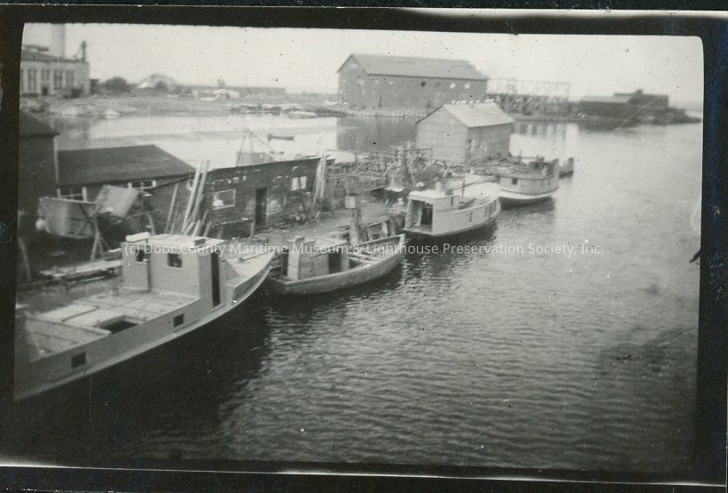 Elevated view of fishtugs docked in Menominee, Michigan, 1924. Warehouse type buildings are on the pier and in the background.Location