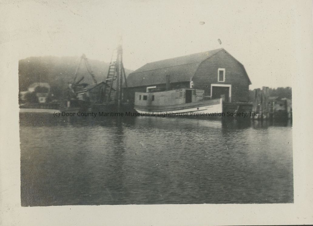 Fish tug Eagle docked in front of unidentified building.