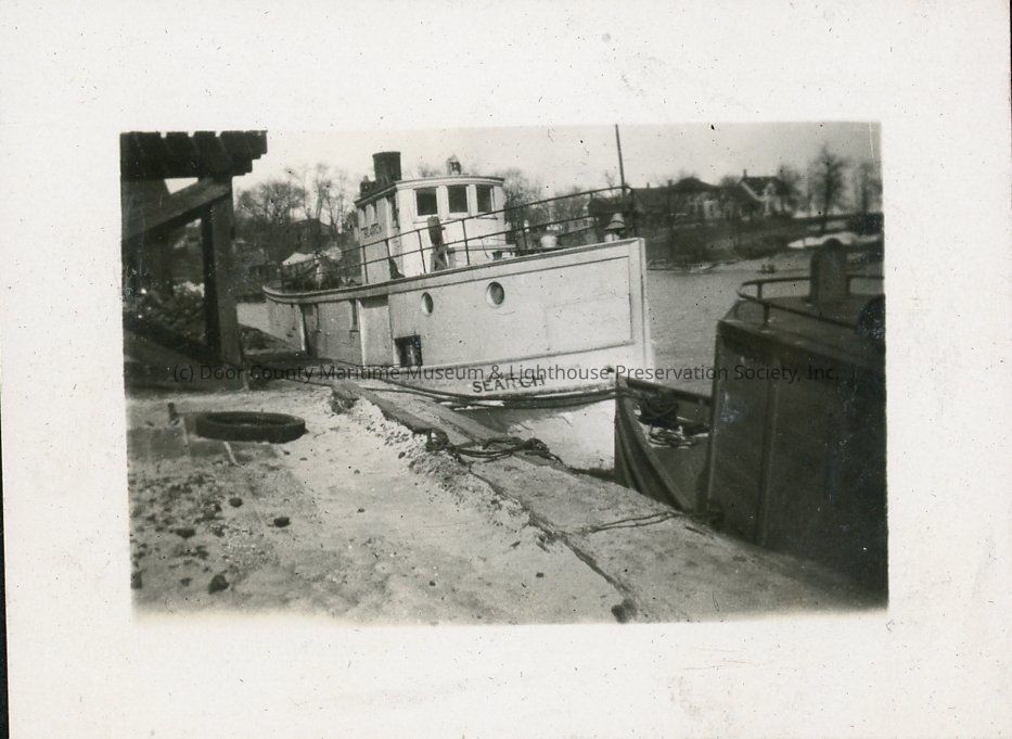 The fish tug Search docked at an unidentified location. Another unidentified vessel is tied up as well.Location