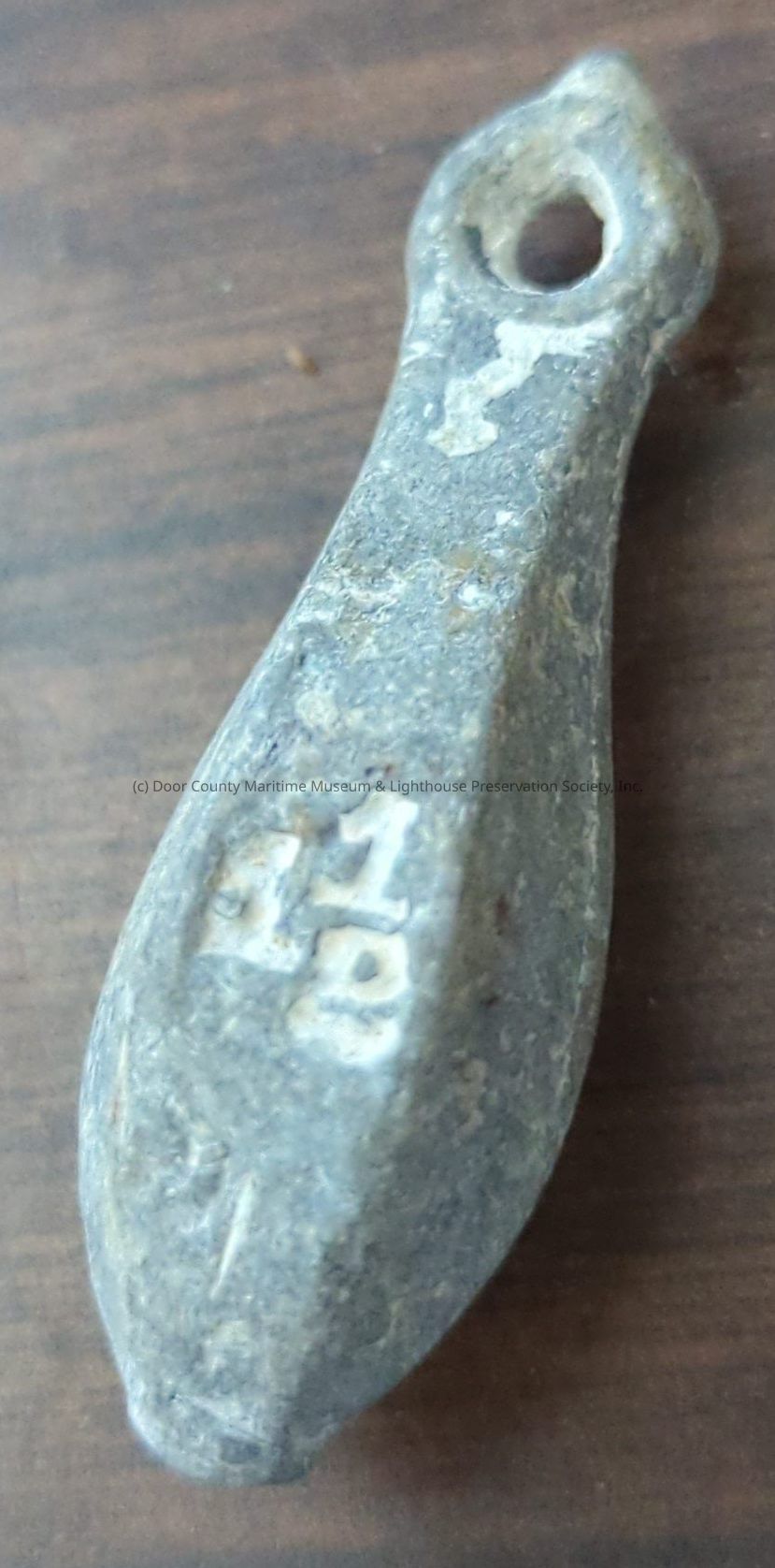 Metal pear shaped fishing line weight with "No. 1/2" engraved on object
