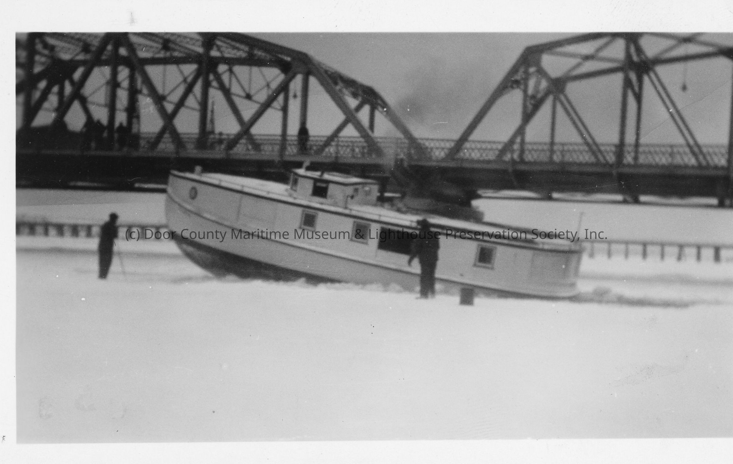 Fishing tug breaking through ice in Bay of Sturgeon Bay with Michigan Street Bridge in backgroundEntry/Object ID