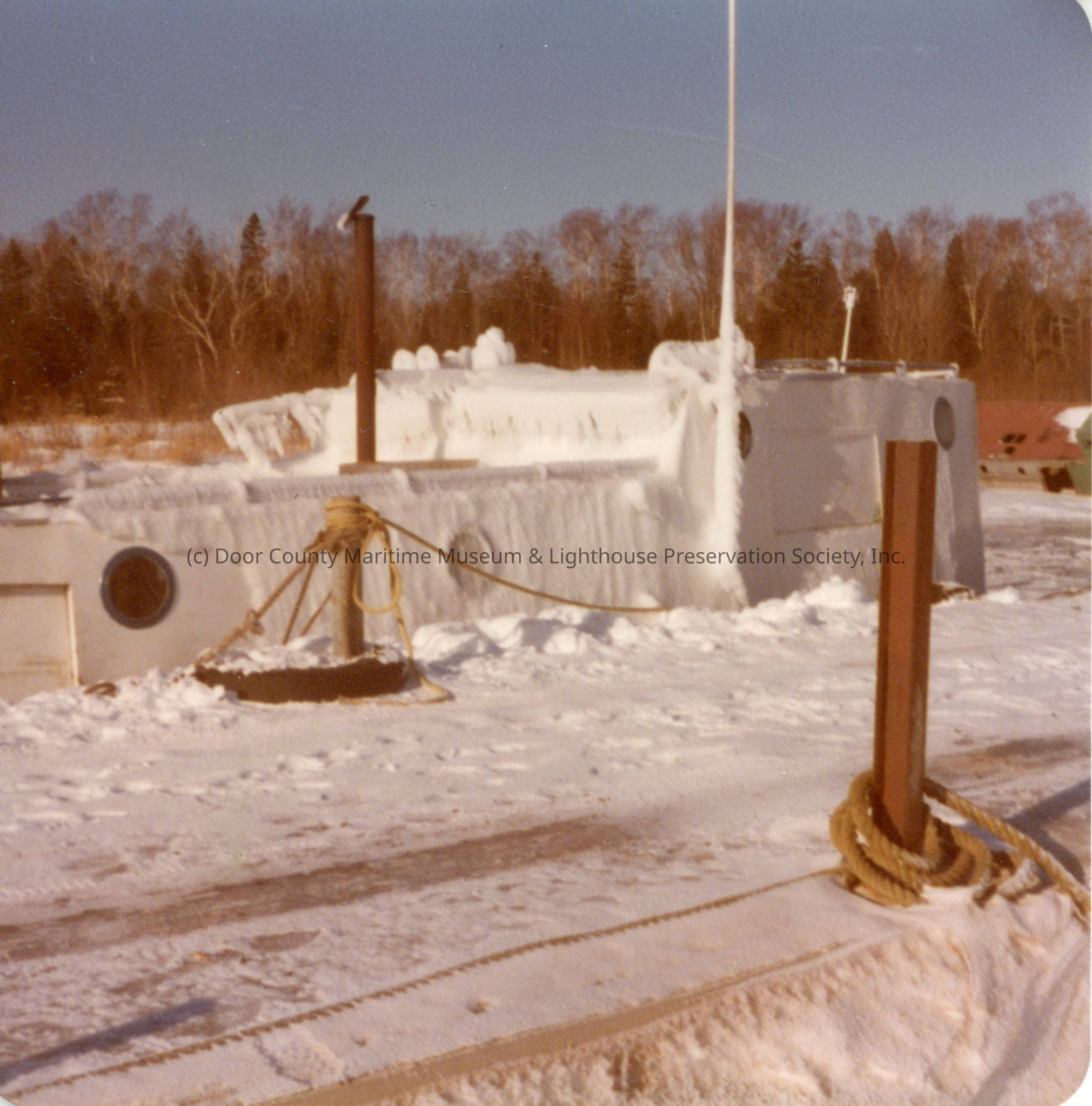 Fishing tug Freitag Bros docked covered in ice during winter
