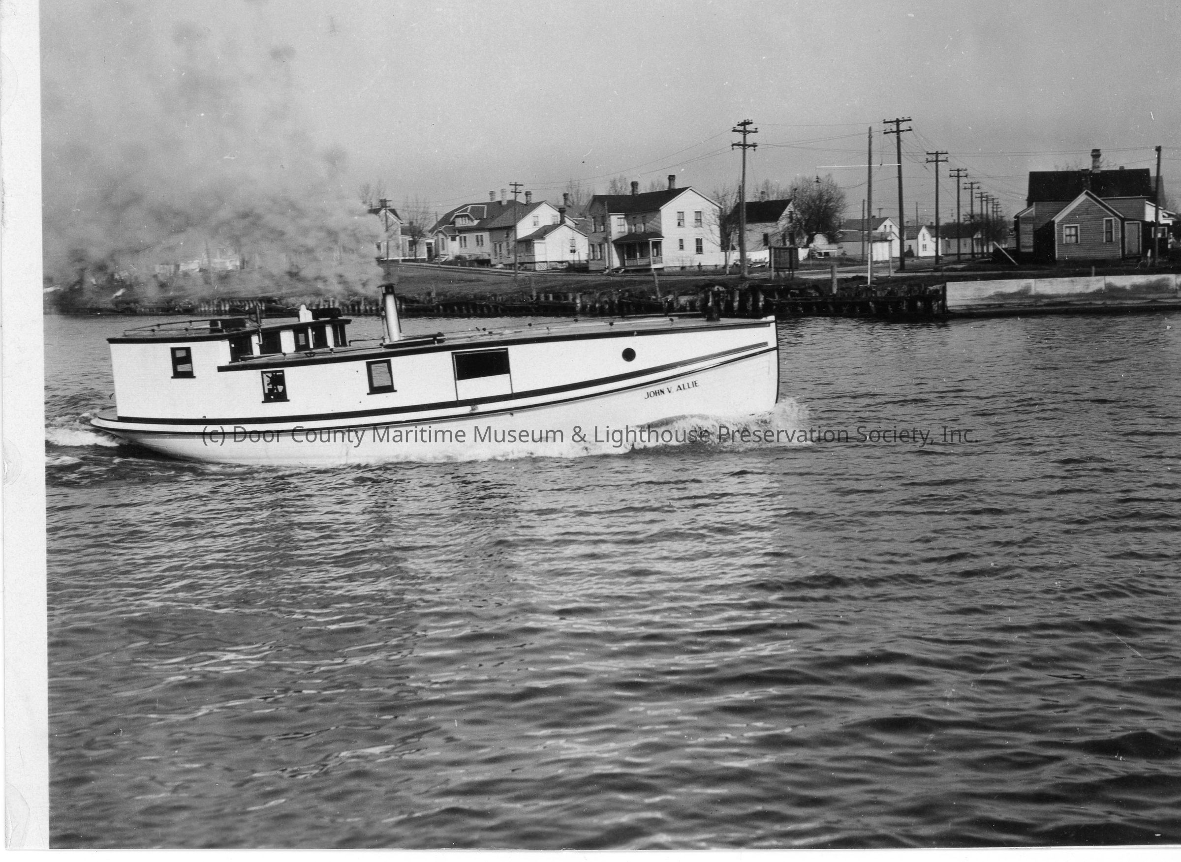 Fishing tug John V. Allie underway with shore in background
