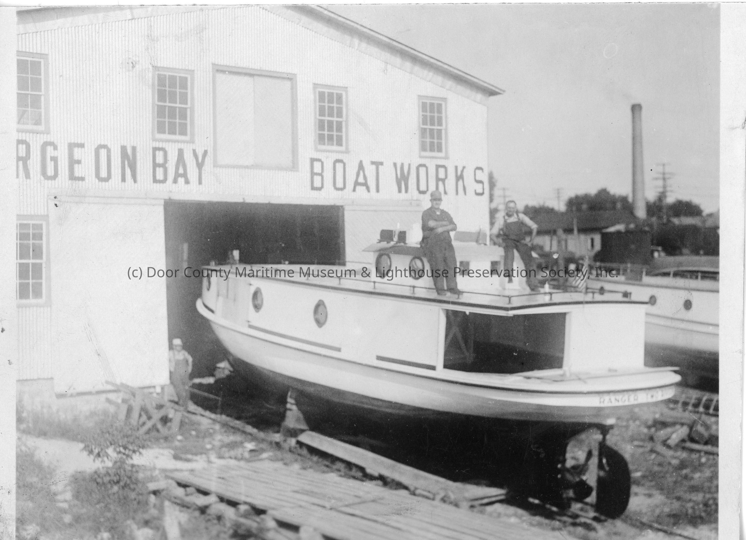 Fishing tug Ranger in cradle in front of Sturgeon Bay Boat Works