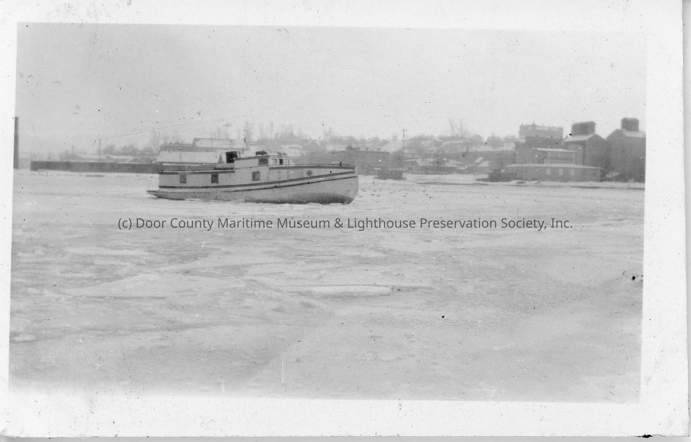Fishing tug underway in icy water