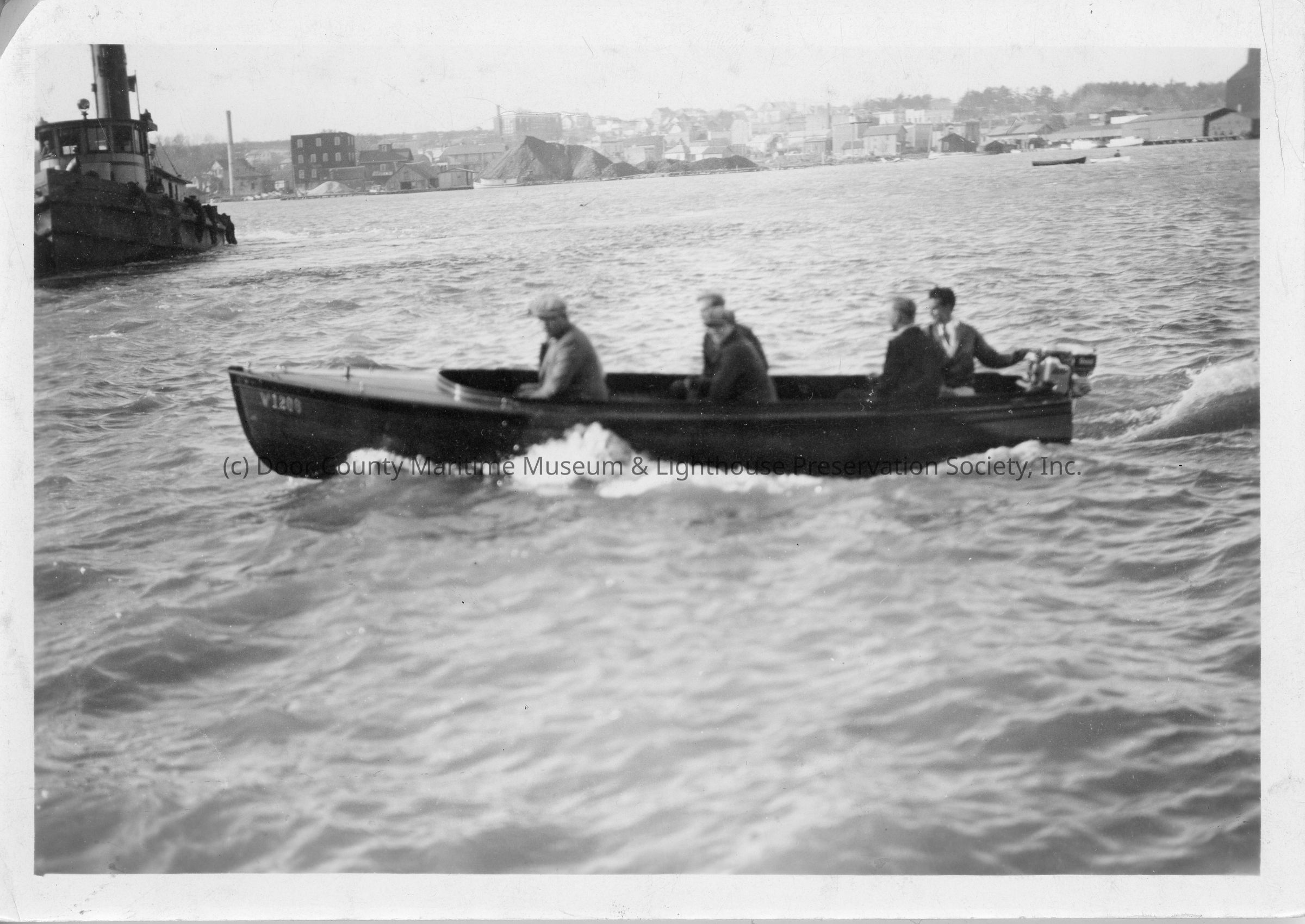 five men in motorboat underway