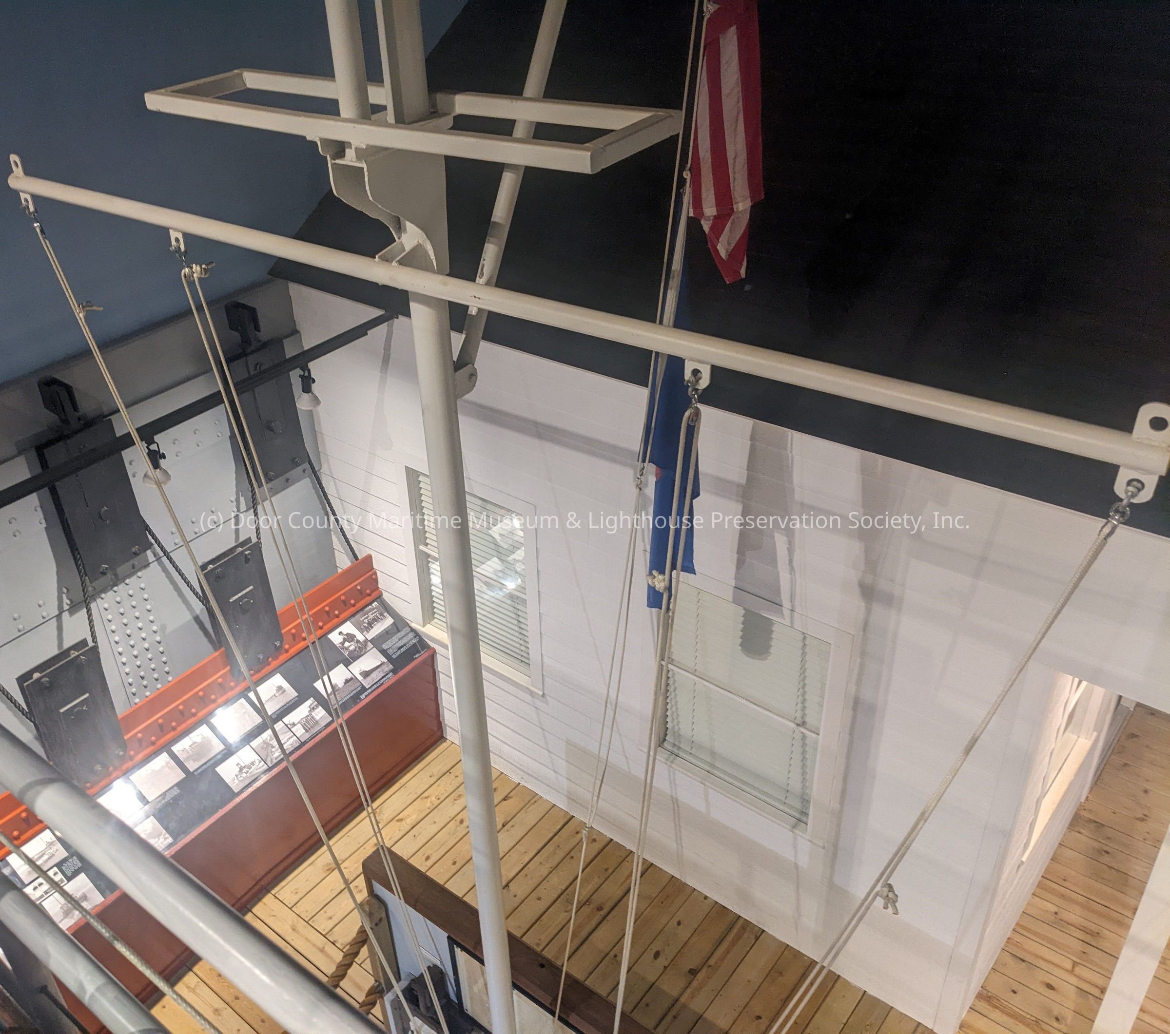overall color white; steel pipe construction; white rope; six black tie down cleats attached to base horizontal board; American Flag and Wisconsin State Flag; now raised; pulleys allow flags to be raised and lowered on main staff; four positions on upper cross member using six cleats for the tie downLocation
