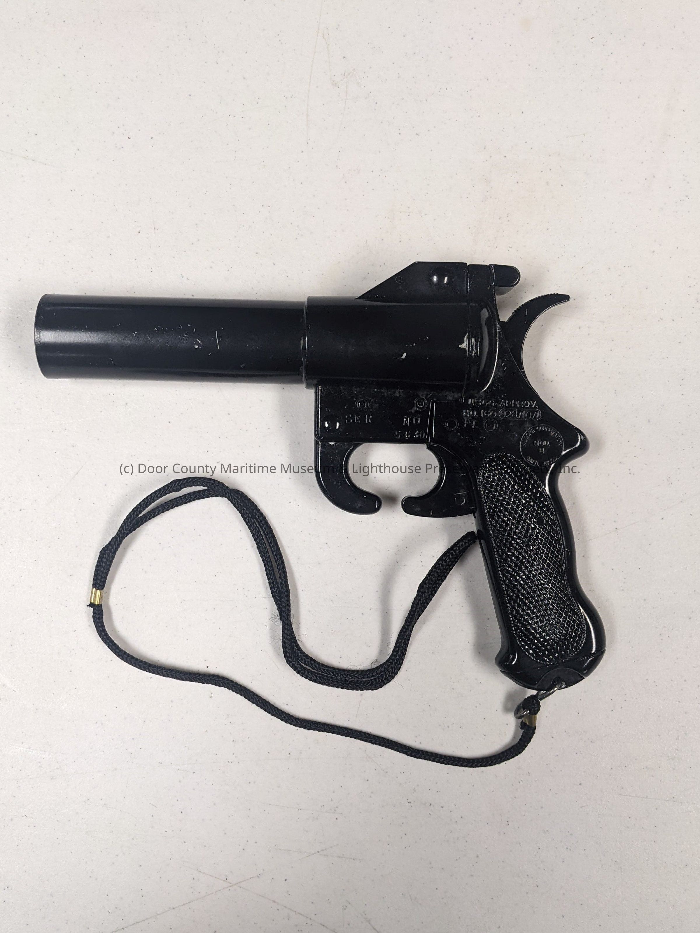 Black metal flare gun. Inscribed on surface "SER NO 5630 USGC Approv. No. 160 028/10.1 PT Kilgore Corporation Mod. B Toone Tenn". Lanyard tied to bottom of handle. Chipped metal throughout the gun. Orange on side. Corroded on interior of barrel.Location