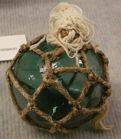 Three clear green glass floats with #11 and a circle on base - seamed at the horizontal center and glass is rough-textured in some places; twine netting around each with a white twine gathered at top.
