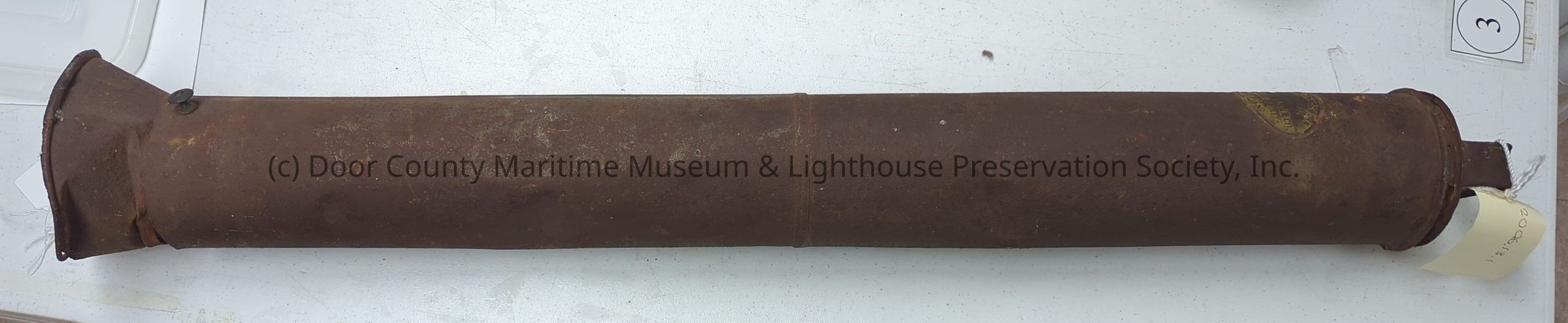 Rusty metal foghorn. Cylindrical with cover with handle on end. “Anderson Foghorn Mfd. By: National Arm Co. Patented 7, July 1868 Boston” stamped into objectLocation