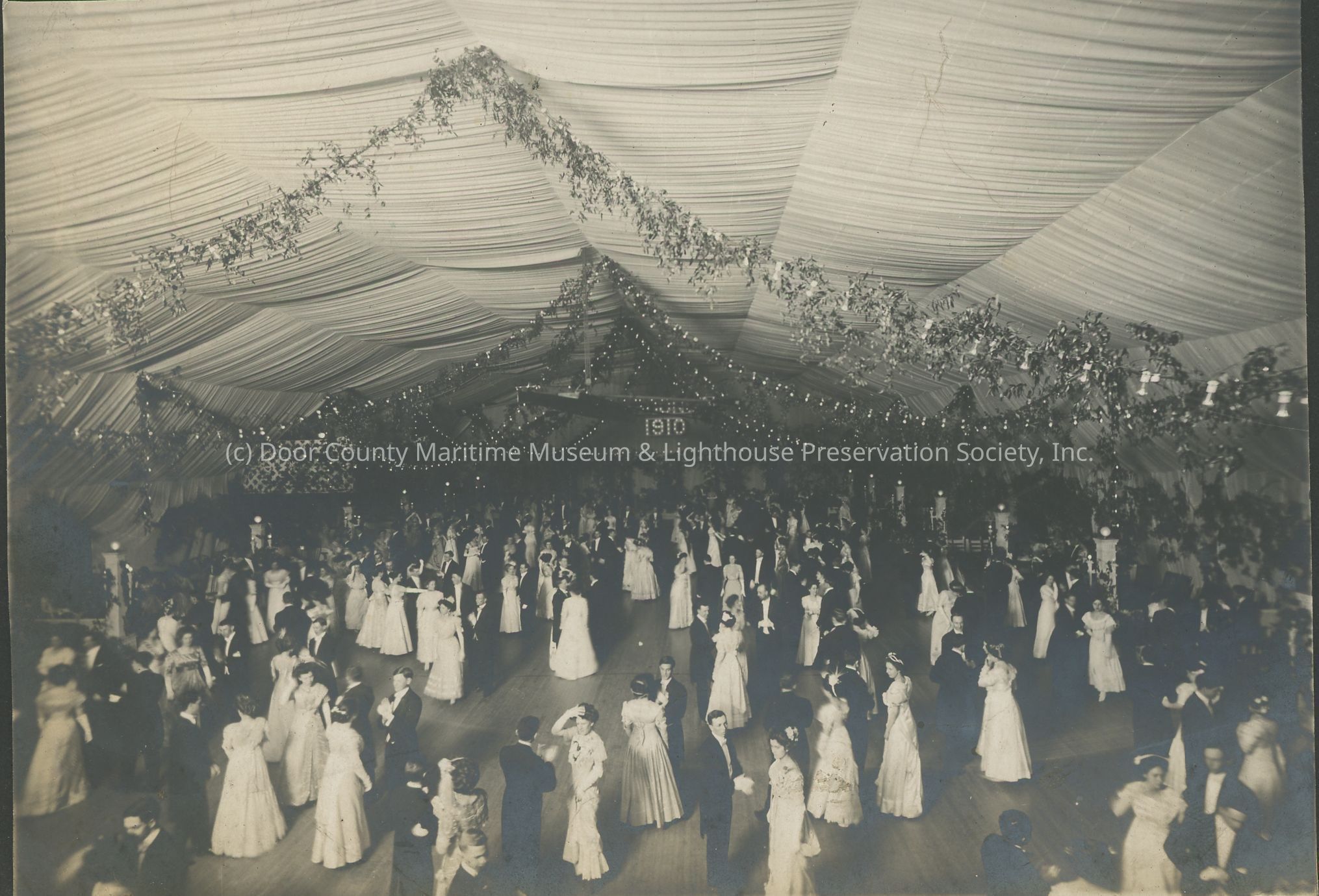 Formally dressed couples at a ball applauding, with 1910 date on the wall.