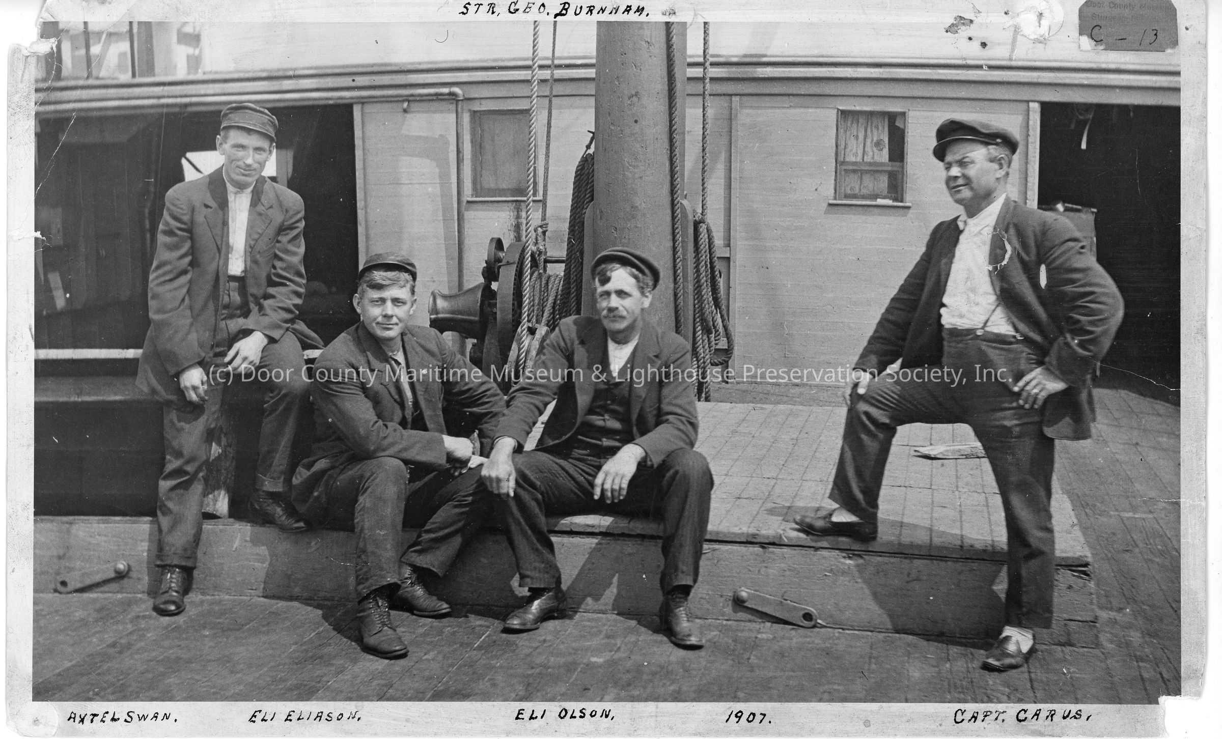 Four men posing in front of Str. Geo. Burnham