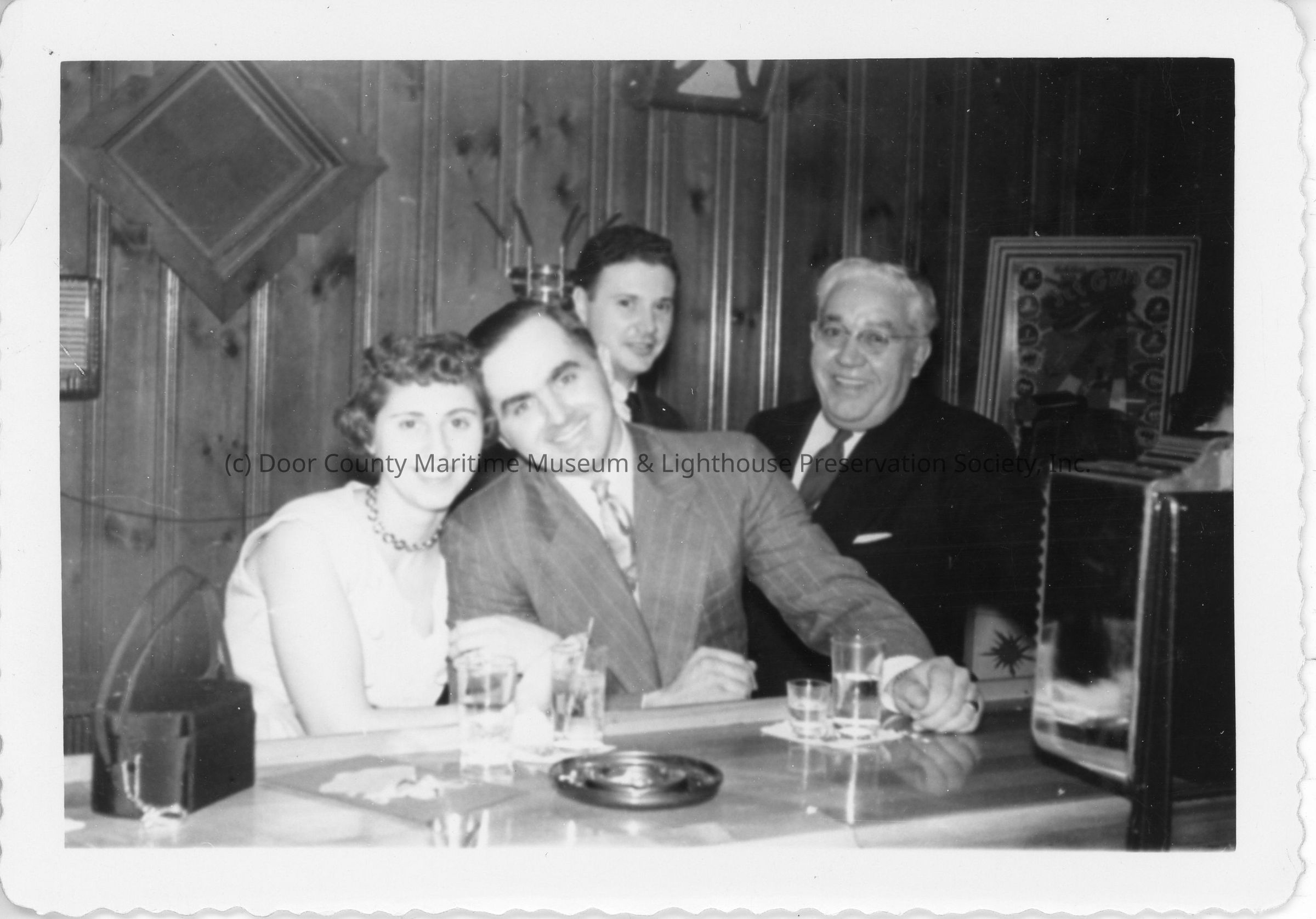 Colorless photograph of Navy Office Party. People include Shiela, Ollie, Joe Davidoff, and Leo La MereLocation