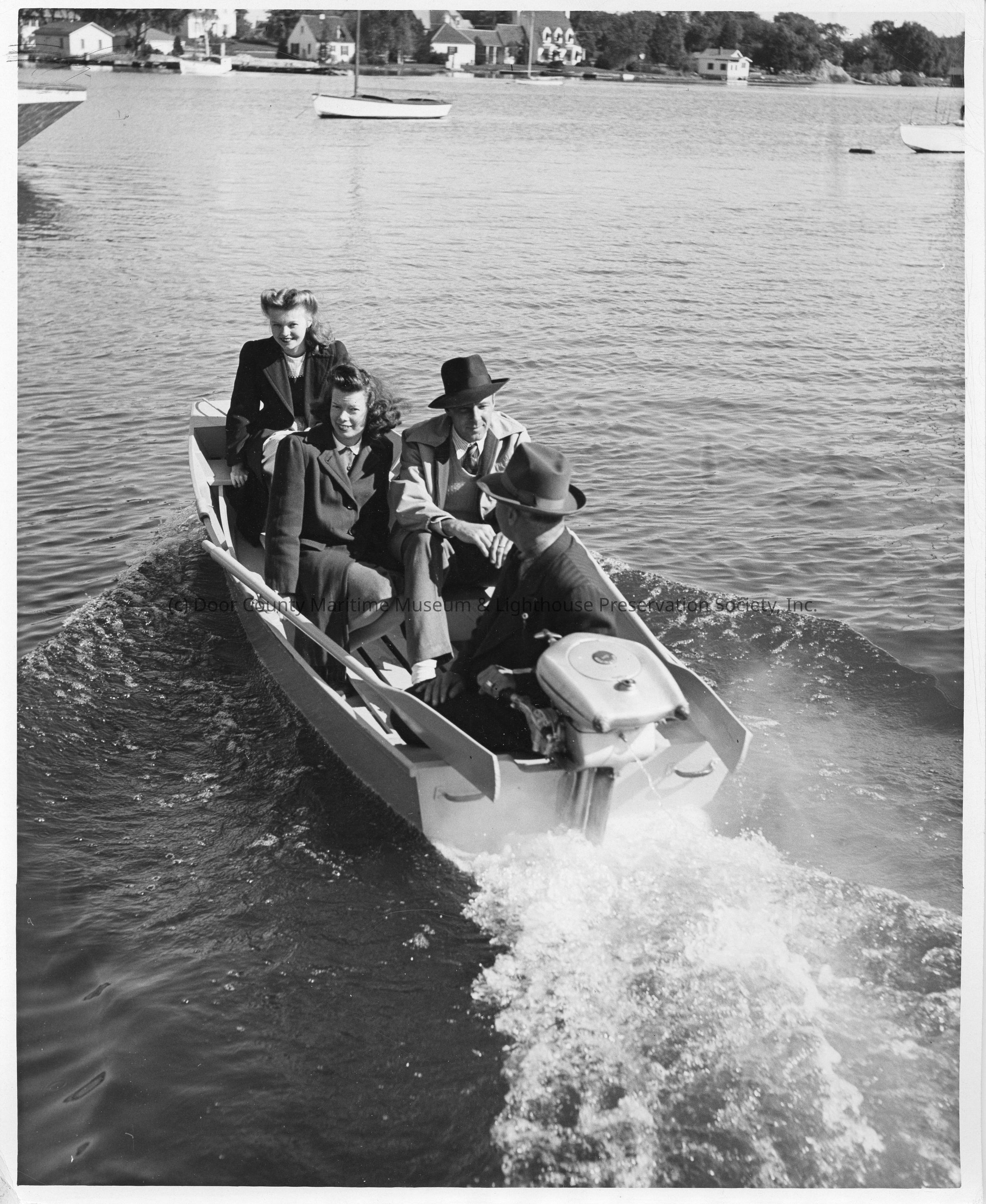 Four people in blunt nose rowboat with outboard motor underway October 11, 1944
